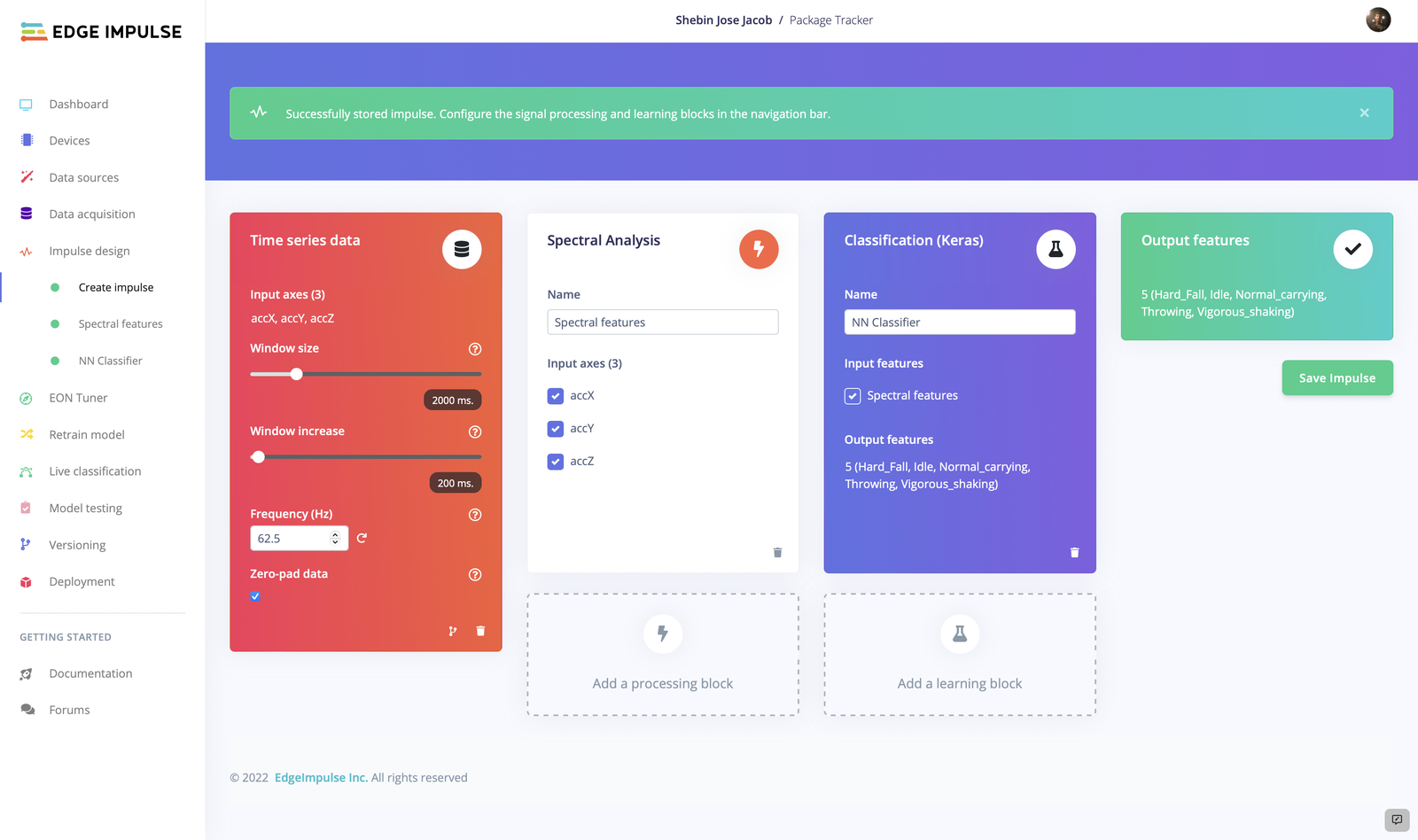 By creating an Impulse in Edge Impulse, you’re creating your own machine learning pipeline. Navigate to Impulse design > Create Impulse An impulse contain 3 blocks : input block, processing block and a learning block. I have chosen Time series data as my input block, Spectral Analysis as the processing block, and Classification (Keras) as the learning block. You can add an anomaly block if you’re interested in detecting anomalous motions, I’m just omitting it for now.