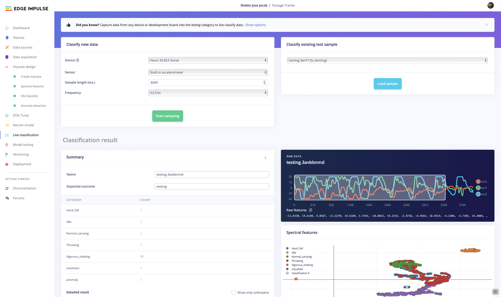 Safe transit of packages is a headache for many online retailers since damage can occur during transit. Damaged shipments lead to a greater number of product returns, a poor customer experience, and negative reputation of the retailers. Since we have no knowledge of what happens during delivery, it might be difficult to prove that a package’s contents were destroyed during travel, as opposed to before or after transfer to a carrier. Due to this lack of transparency, both unfair accusations or deliberate fraud are possible. As a solution, we are designing a device that can monitor the safe handling of packages during transit. This device uses an Arduino Nano 33 BLE Sense and a GSM module, along with Edge Impulse to identify the locations where impetuous handling of the package occurs. Using the accelerometer data, the device can identify possible insecure handling that occurred during the transit. When insecure handling is detected by the device, an alert is generated in our system which logs the current time of the incident. The log can be analyzed by the retailer as part of an internal audit to analyze the performance of the courier services. The user can also track the handling of the package using the web interface provided. This device is extremely useful in transporting Handle With Care packages that should be handled very carefully.How Does It Work?