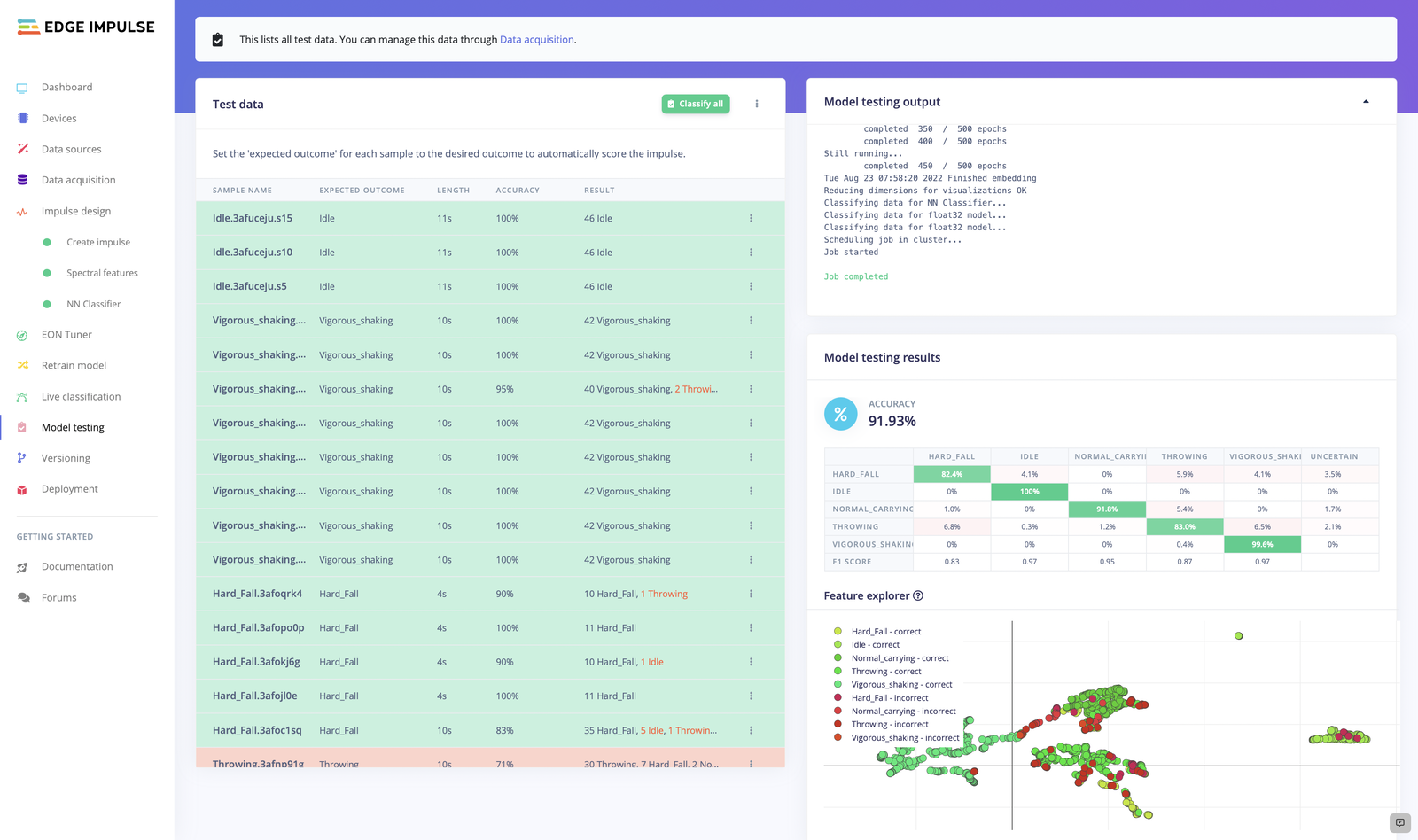 Once the model is trained, we can now test it to see how it performs with new data. Select Classify All under Model Testing. The model’s performance on our testing data is displayed in the Model testing results tab. Our accuracy is 91.3%, which is still quite good. You can also look at the Confusion matrix to determine which labels are most susceptible to error. On the basis of this, you can expand the training dataset for these classes with additional items.