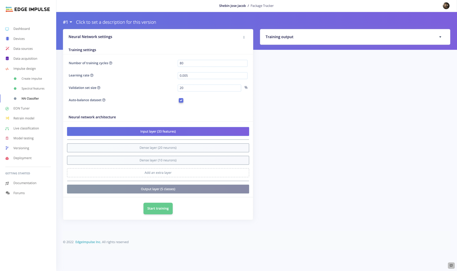 Model training is the phase in which the neural network tries to fit the best combination of weights and biases to a machine learning algorithm to minimize a loss function. In the NN Classifier tab, under the Impulse Design menu, we can configure various parameters that influence the training process of the neural network. I have changed the default values as shown in the image to attain better accuracy.