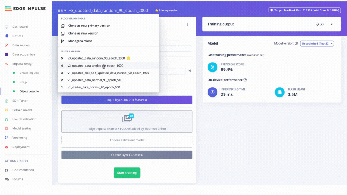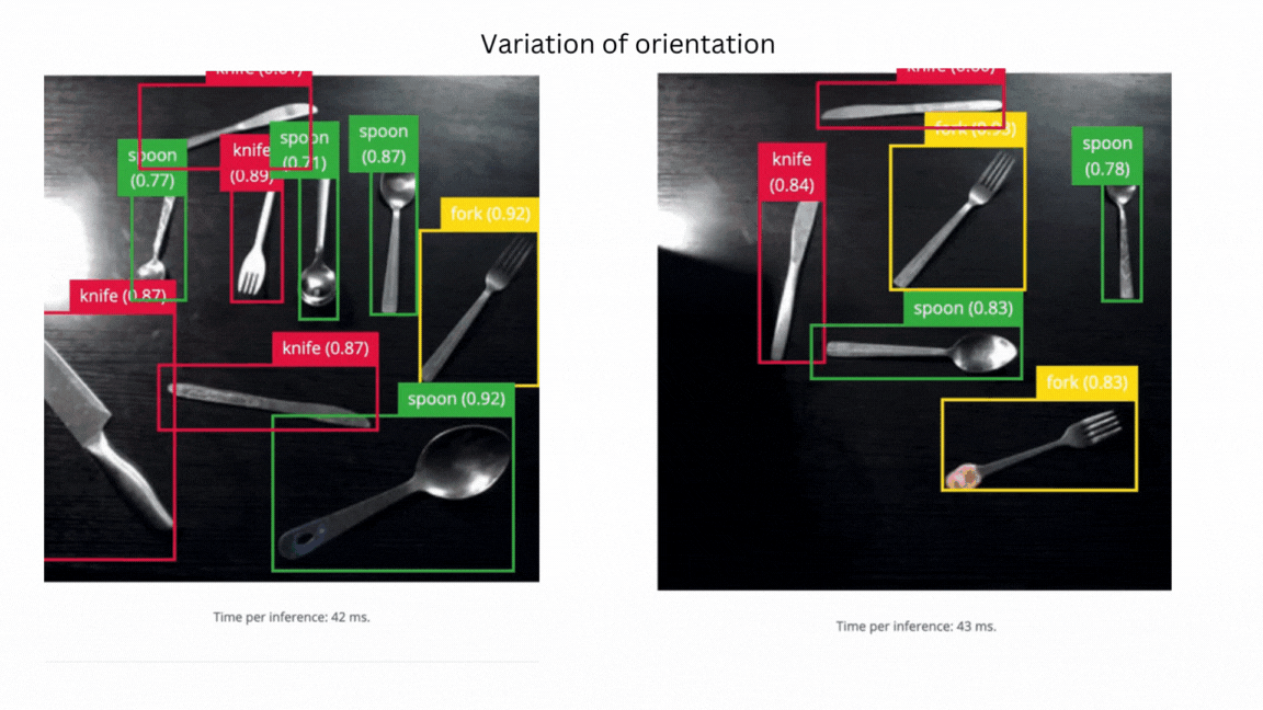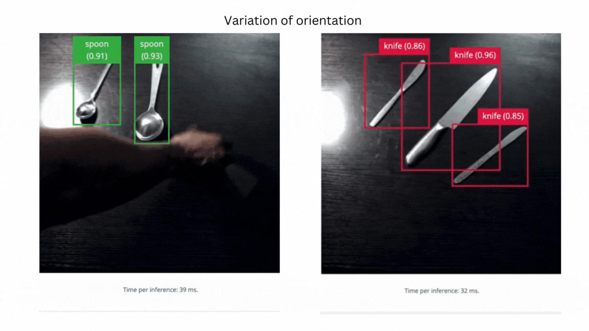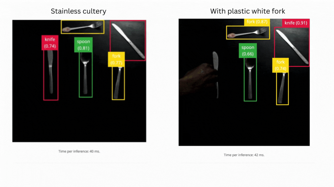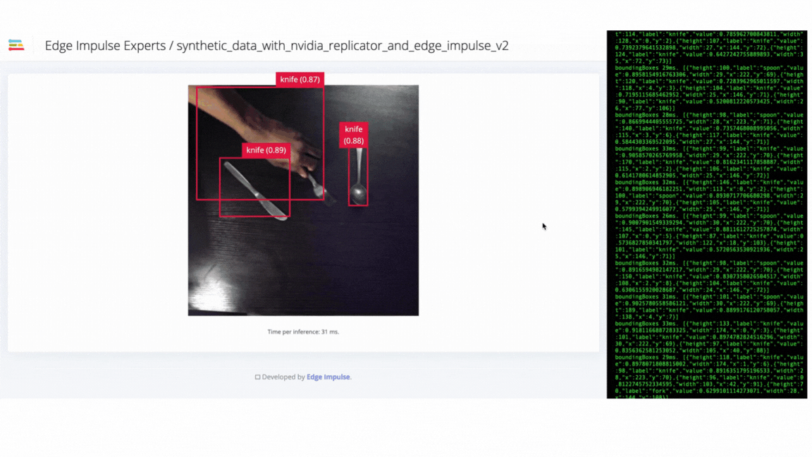 We used the Edge Impulse CLI tool to evaluate the model’s accuracy by downloading, building and running the model locally. A Logitech C920 webcam streamed the live video of objects on a table from 50 cm to 80 cm from the camera. The position of the camera remains fixed during the experiment. The clips below show that the trained model does not generalize well to real-world objects. Thus we needed to improve the model by uploading, annotating and training the model with the V2 dataset.