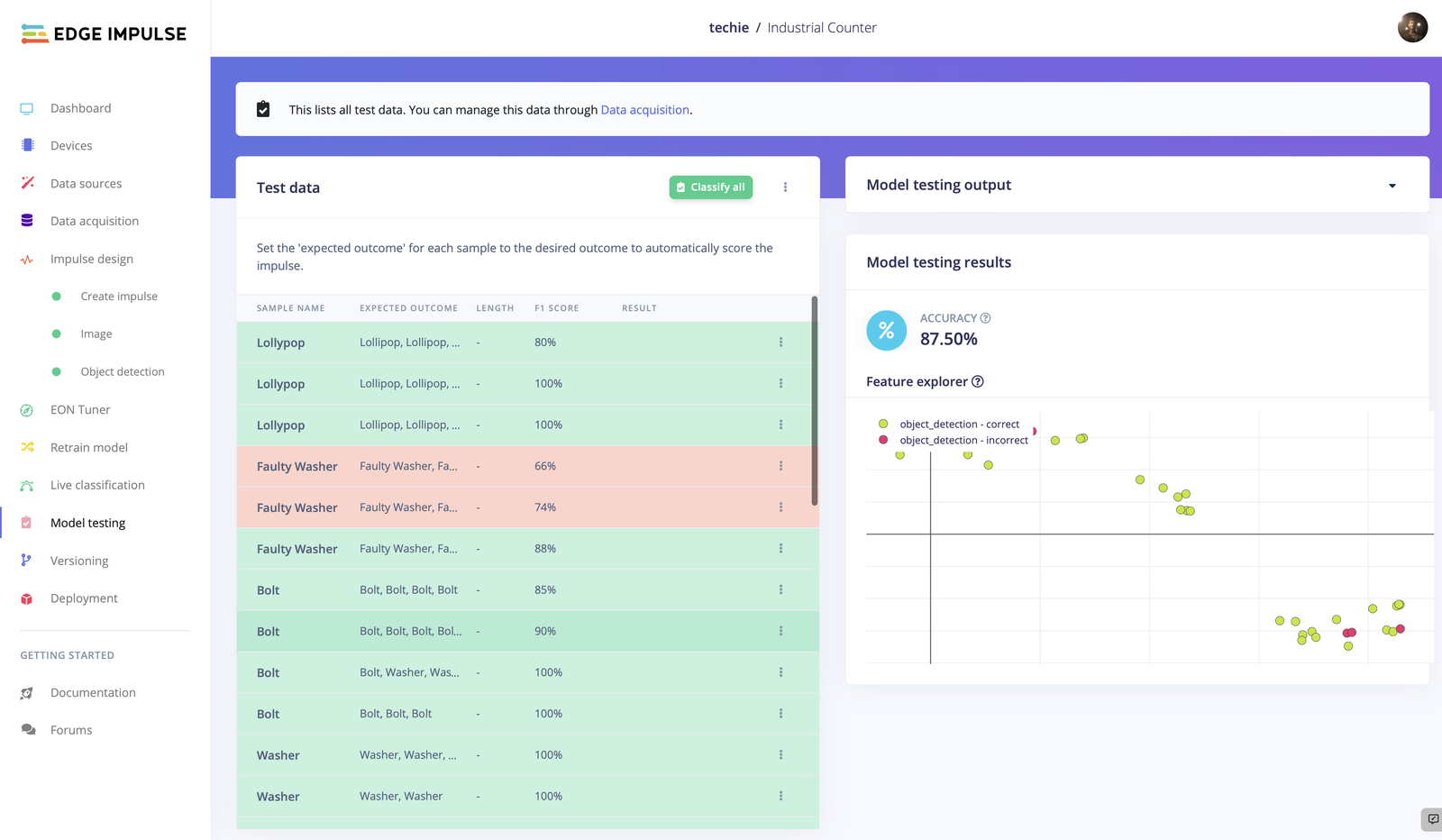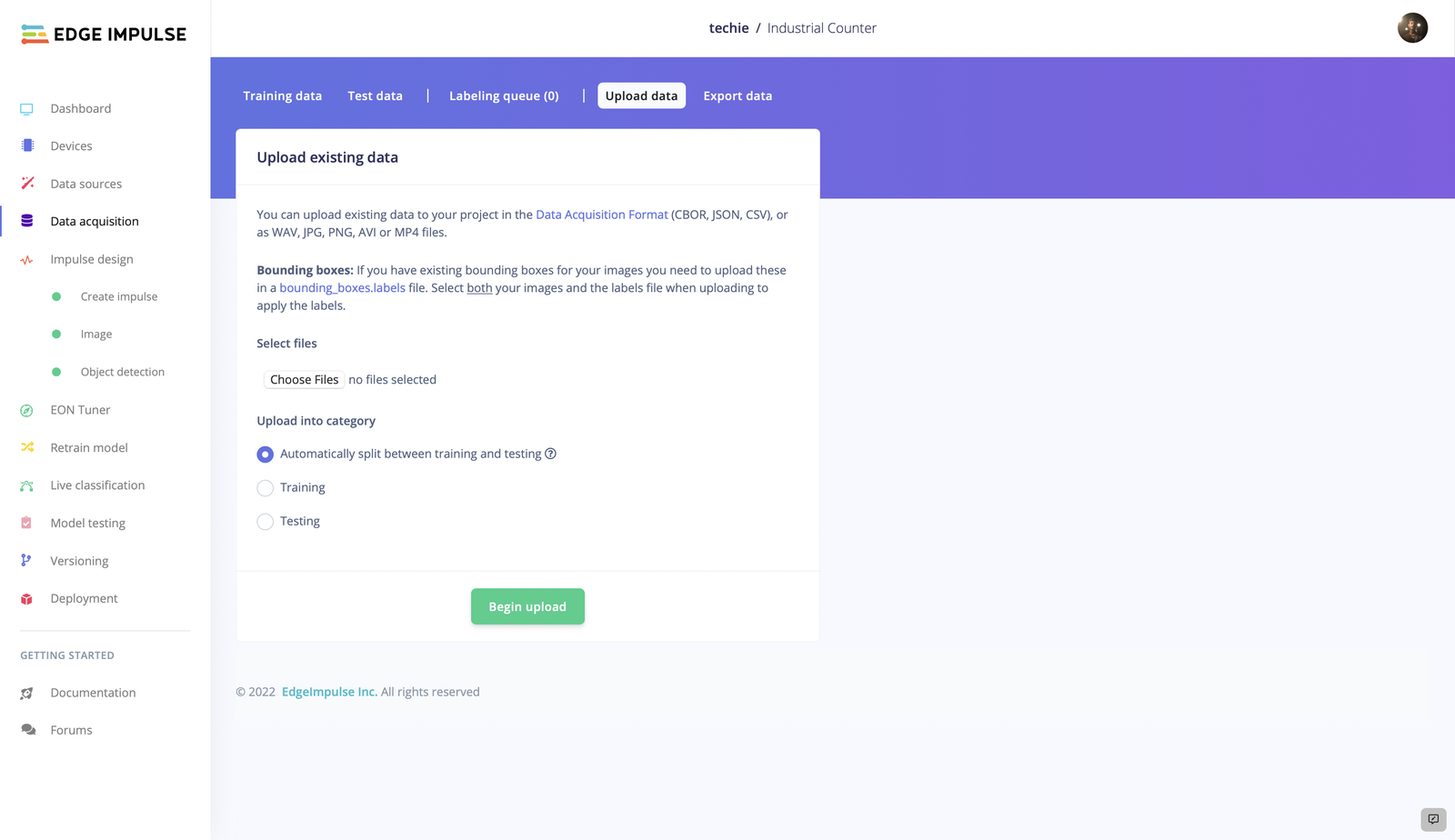 Every machine learning project starts with data collection. A good collection of data is one of the major factors that influences the performance of the model. Make sure you have a wide range of perspectives and zoom levels of the items that are being collected. You may take data from any device or development board, or upload your own datasets, for data acquisition. As we have our own dataset, we are uploading them using the Data Acquisition tab.