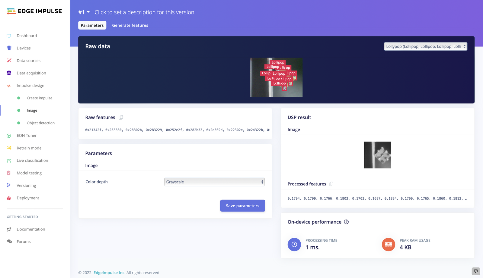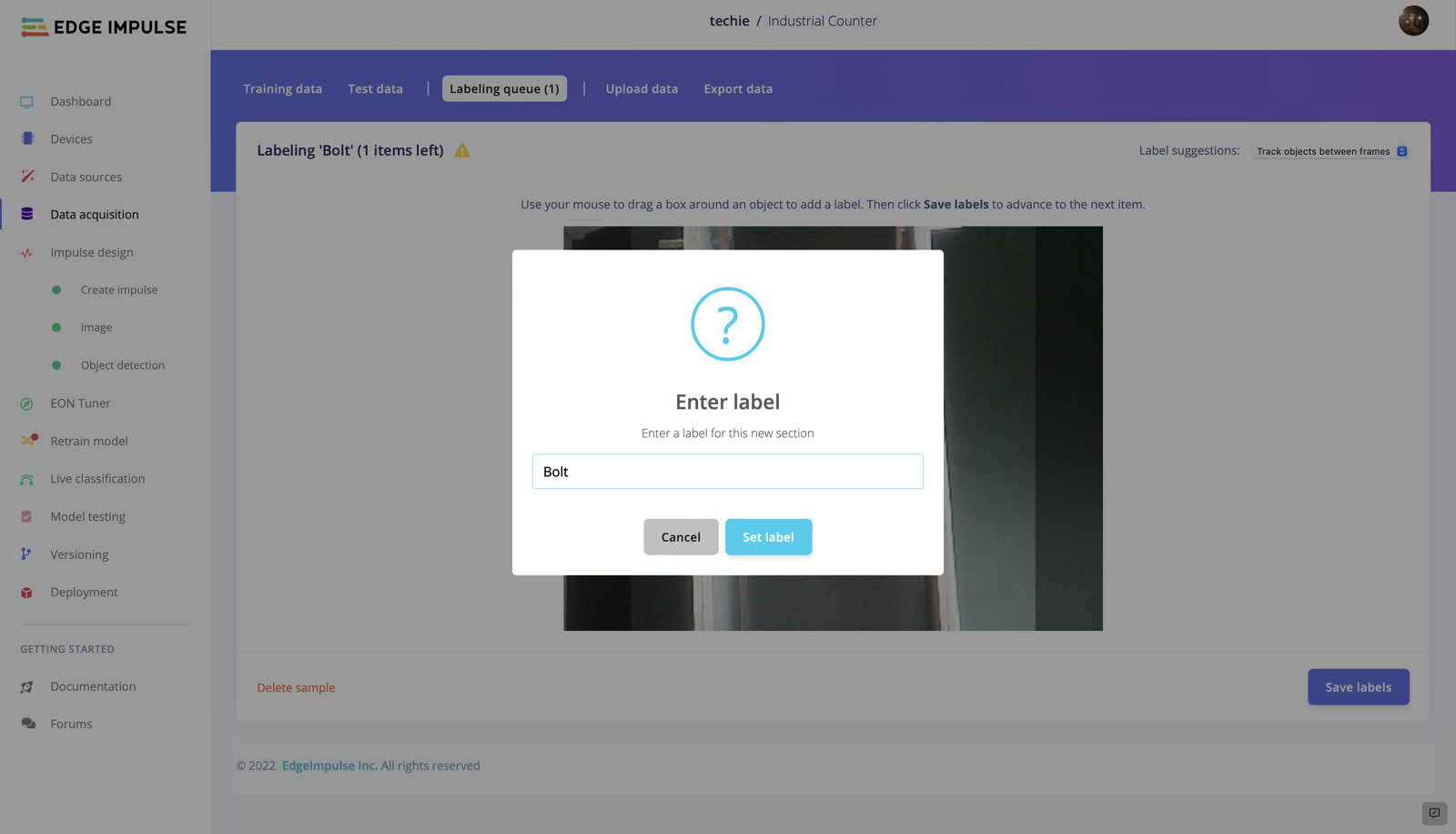 You may view all of your dataset’s unlabeled data in the labeling queue. Adding a label to an object is as simple as dragging a box around it. Edge Impulse attempts to automate this procedure by running an object tracking algorithm in the background in order to make life a little easier. If you have the same object in multiple photos the box moves for you and you just need to confirm the new box. Drag the boxes, then click Save labels. Continue doing this until your entire dataset has been labeled.