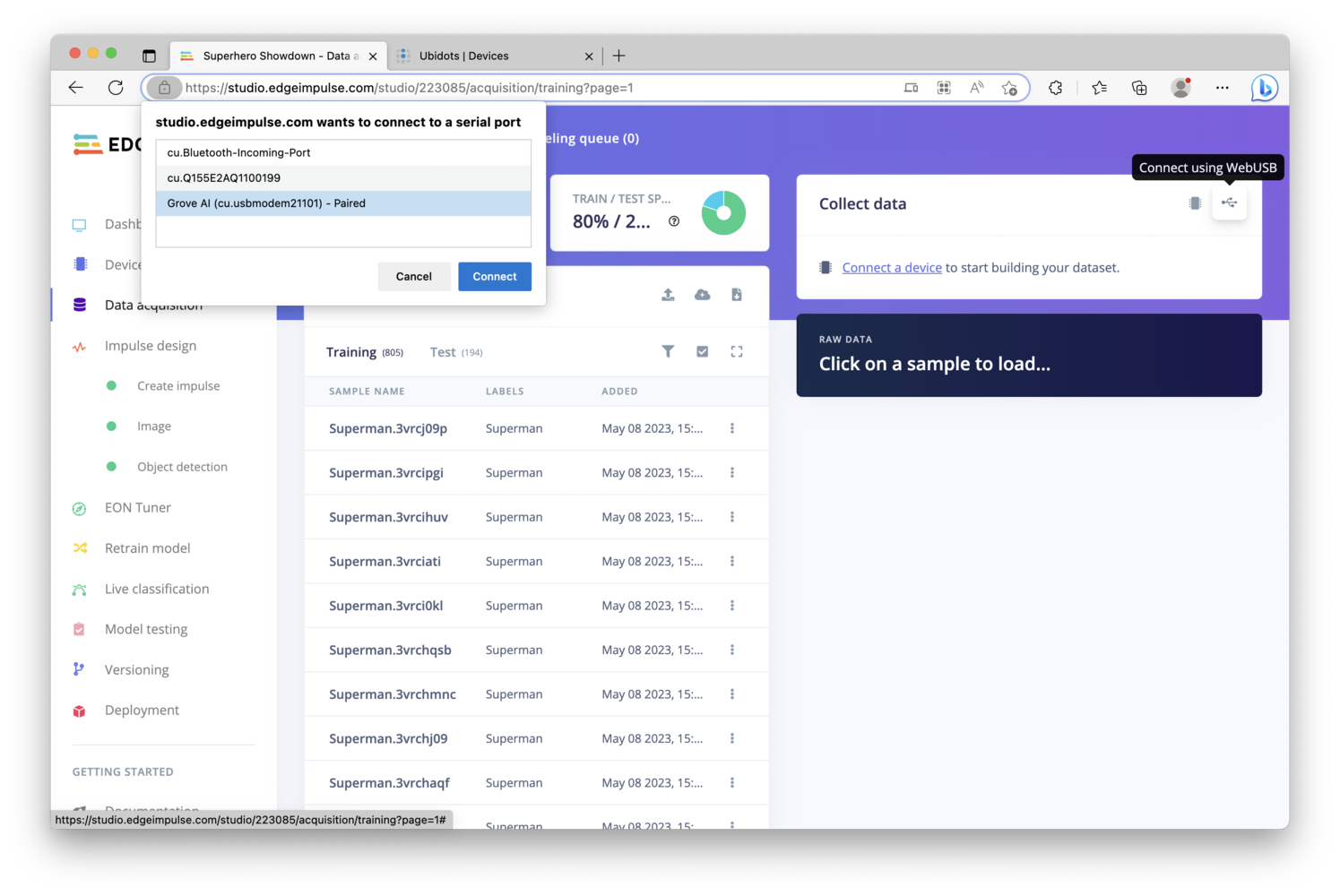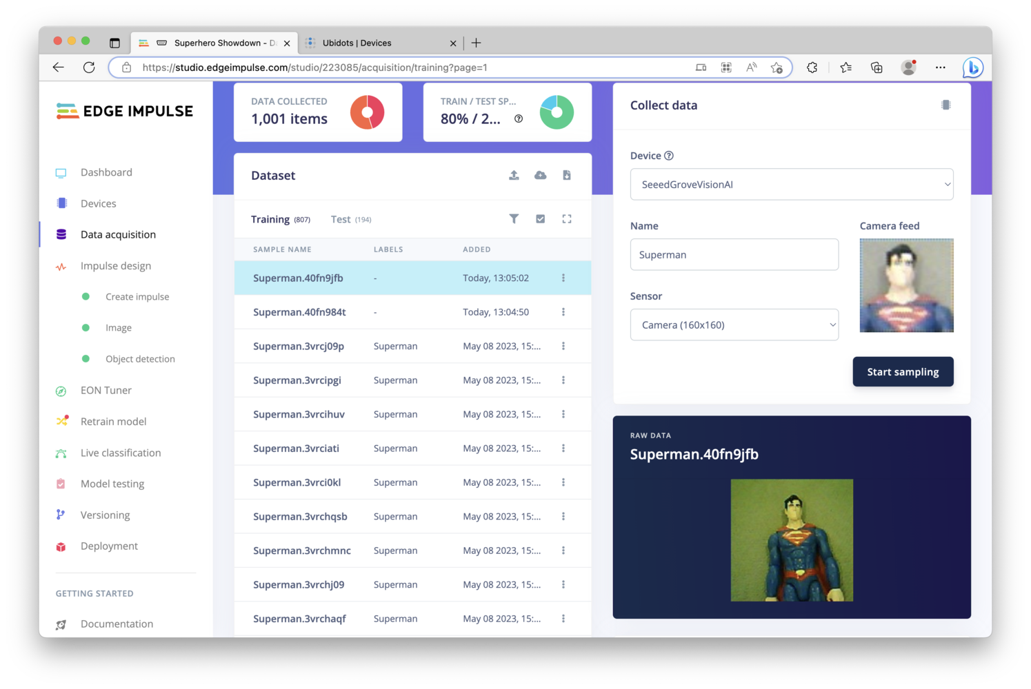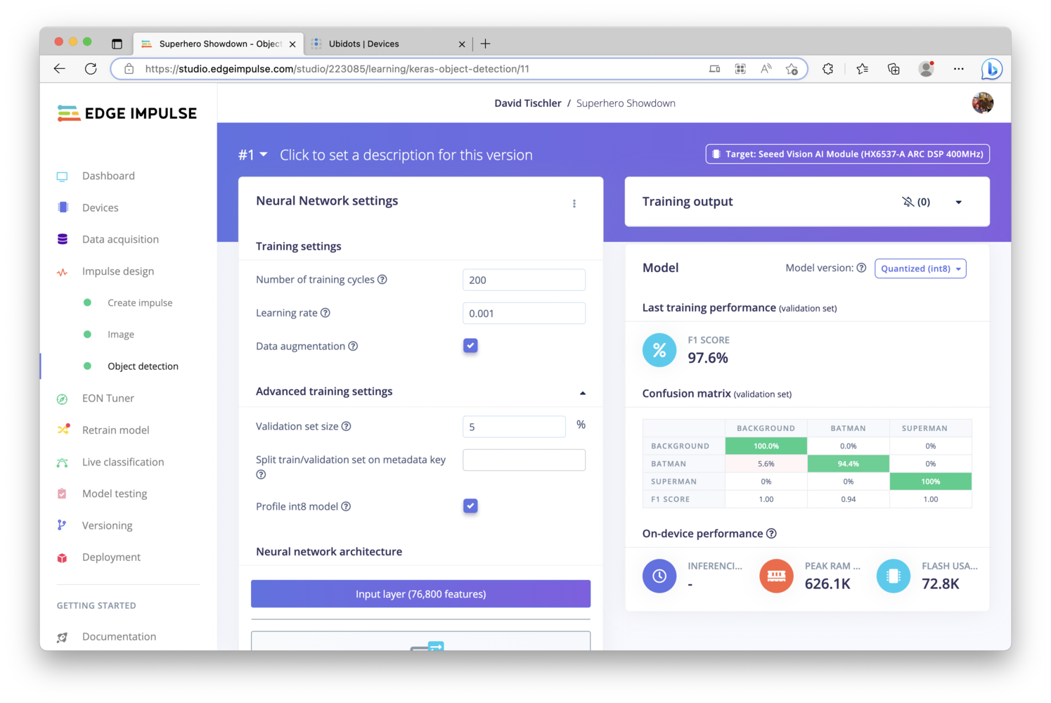 The Seeed Studio Grove Vision AI Module is a small TinyML-capable board equipped with a Himax HX6537-A processor and an OV2640 camera, capable of running computer vision models directly on the board. There is also a microphone, accelerometer, and gyroscope, and Arduino library support for simple programming. The board is also fully supported by Edge Impulse, so you can build and deploy machine learning models with ease. In this project, we’ll build a machine learning model that can identify Batman versus Superman, deploy the model to a Grove Vision AI, capture the inference results from the board, and send the results to a Ubidots cloud dashboard for visualization.