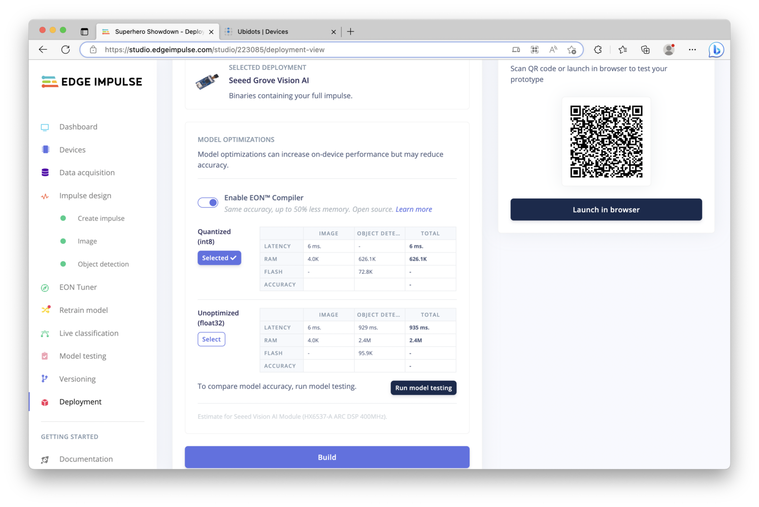 With the computer vision model created and promising results shown in the Confusion Matrix, we can now build firmware and load it onto the Grove Vision AI Module. Click on “Deployment” on the left navigation, then scroll down and click “Build” (the Grove Vision AI Module should already be selected. If not, simply choose it.) and wait a moment for the process to complete.