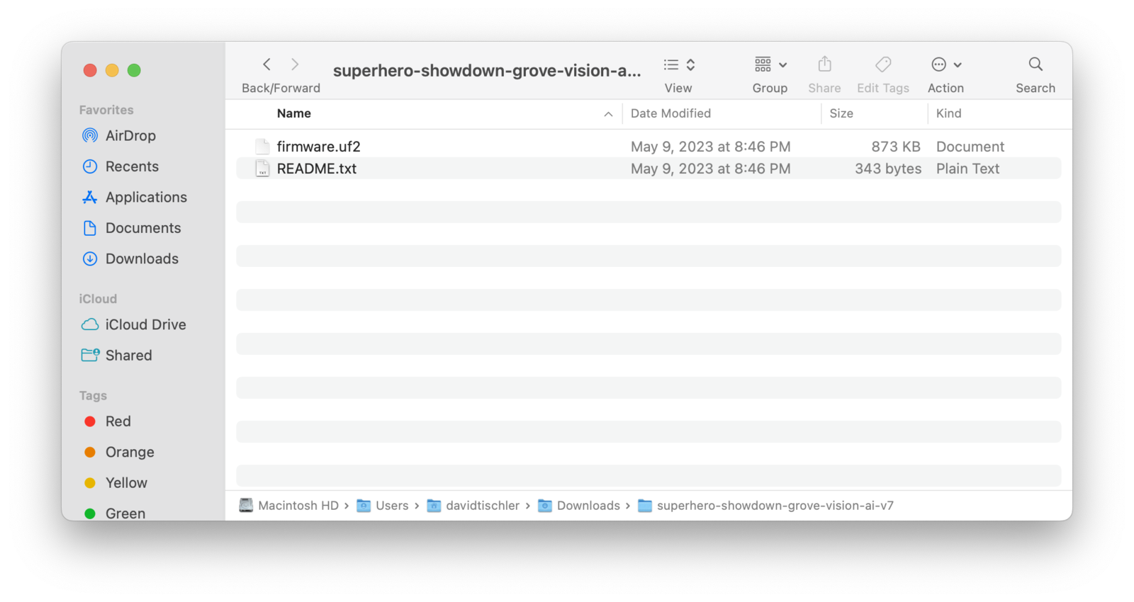 .zip file will be generated and downloaded. Unzip it, and you will find a file named firmware.uf2. To transfer it to the Grove Vision AI, double click the “boot” button on the board, to place the device into storage mode. A new storage location should show up on your computer, essentially like a USB drive. Then, you can simply drag-and-drop the firmware file into the storage device. The file will copy over, and once it’s complete, the device will reset and the drive will unmount itself.