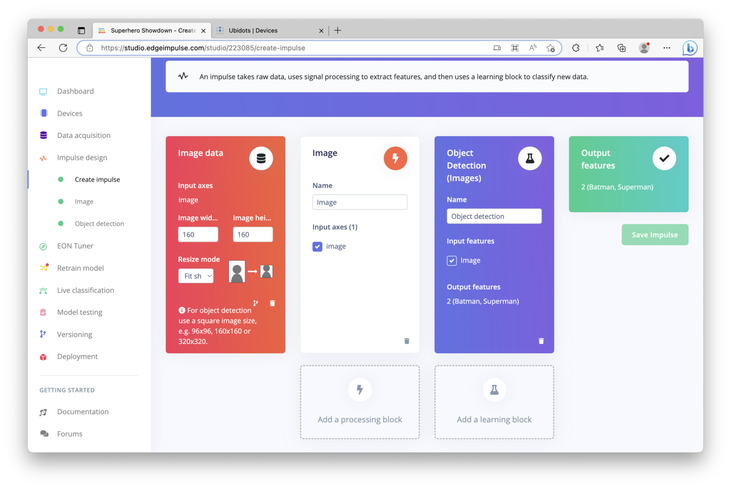 Once you have a few hundred images captured and labeled, it is time to build an Impulse, which is the machine learning model that will ultimately run on the Grove Vision AI Module. An Impulse consists of a Processing Block and a Learning Block. These can vary depending upon the type of project you are building, but as this is an object detection project, we’ll add an Image Block and Object Detection Block, make sure the Image Width and Height are set to 160 pixels in the Image Data block, and then click the “Save Impulse” button towards the right.