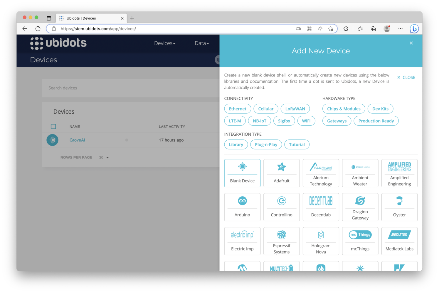 - Create a Ubidots account and add a Device (a “Blank Device” will work fine).