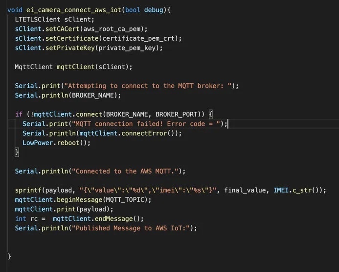 Once I get the model prediction, I connect to a cellular network and send data to AWS IoT Core over MQTT. Before you can connect to AWS IoT Core, you need to:- Create a policy