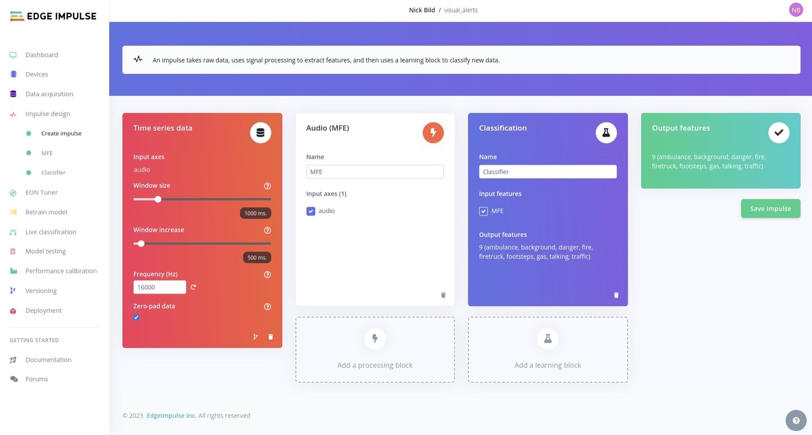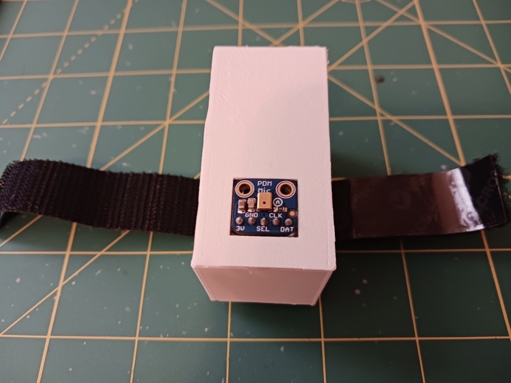 The Particle Photon 2 development board is wired to a supported PDM MEMS microphone that comes with the Edge ML Kit for Photon 2. Wiring diagrams can be found in the documentation. After assembly is completed, this hardware can be powered by a LiPo battery (a 400 mAh battery was used in this project). An audio classification neural network was developed with Edge Impulse Studio to distinguish between eight types of sounds (ambulance, danger alarm, fire alarm, firetruck, footsteps, gas alarm, talking, traffic sounds), as well as normal background noises. When one of the sounds is recognized, the Photon 2 will send a program to the Brilliant Labs Monocle, wirelessly via Bluetooth Low Energy, which is attached to a pair of glasses. This causes text to be overlaid on the wearer’s peripheral vision. The text provides a visual alert to warn of a sound that otherwise could not be heard. The Photon 2, microphone, and battery were placed inside a 3D printed case. A velcro strap was attached to the case such that it could be attached to a belt.