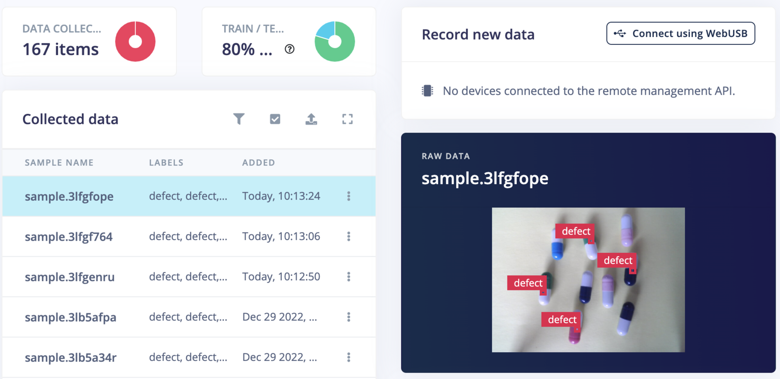 This project requires high-speed inferencing in real-time to detect defects and assist the manufacturing process. The reComputer Jetson Xavier NX (8GB RAM) is used for development, and deployment as well. A 5-megapixel USB webcam is used to capture images. The headless reComputer is connected to a router using a USB WiFi dongle and is accessed using an SSH connection.