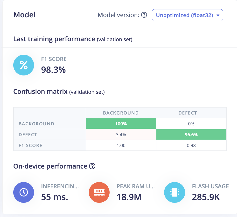 Once the training is completed we can see the confusion matrix as shown below. For the unoptimized float32 model, the F1 score is 98.3% which is very good.