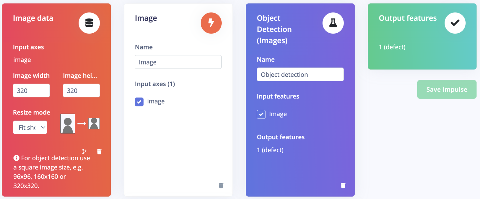 Go to the Impulse Design > Create Impulse page, click Add a processing block, and then choose Image, which preprocesses and normalizes image data, and optionally allows you to choose the color depth. Also, on the same page, click Add a learning block, and choose Object Detection (Images) which fine-tunes a pre-trained object detection model on your data. Since the defects are usually tiny, and knowing that the reComputer is a very powerful device, we are using a 320x320 image size for better resolution for detection. Now click on the Save Impulse button.