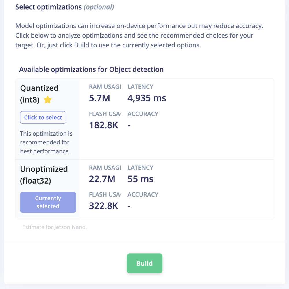 To achieve the highest possible inferencing rate we will be running the model using the GPU on the Jetson Xavier NX. On the Deployment page, we will choose NVIDIA TensorRT Library from the Deploy your impulse section.