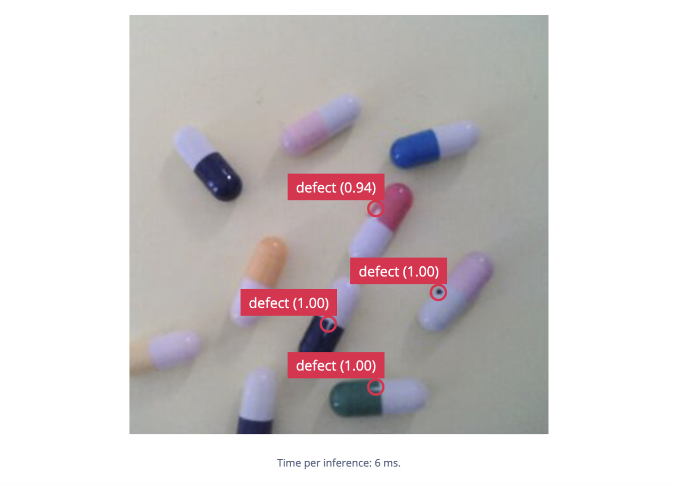 This project aims to use Edge Impulse Studio to collect data and train a model for the anomaly detection task. In the preliminary trials, the supported off-the-shelf image classification or object detection models perform poorly to detect tiny defects on the small capsules. Usually, Generative Adversarial Networks (GAN) or Autoencoder based models are used for anomaly detection for similar datasets. However, the Edge Impulse FOMO algorithm works quite well for the given task. FOMO uses an architecture similar to a standard image classification model which splits the input image into a grid and runs the equivalent of image classification across all cells in the grid independently in parallel. By default the grid size is 8x8 pixels, which means for a 320x320 image, the output will be 40x40 as shown in the image below.