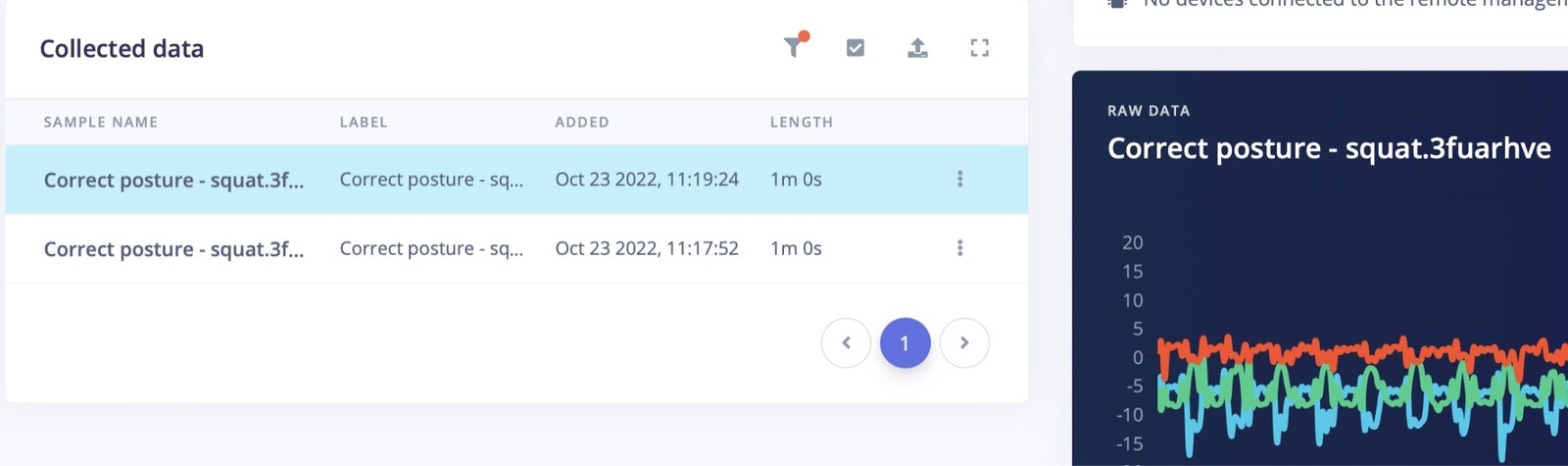To start to collect the data for desired postures (Correct , Incorrect) I have worn the belt with the Thunderboard Sense 2 attached, and started recording accelerometer data. The data classes acquired were walking, correct sitting posture, incorrect sitting posture , correct lifting posture (squat), and incorrect lifting posture (bent down).