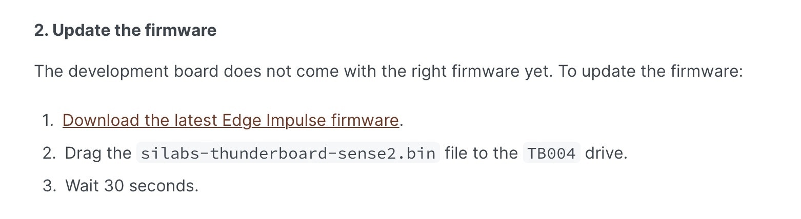Go to the Deployment section in Edge Impulse, and select the firmware option for the Thunderboard Sense 2. This will generate and download the firmware files to your system. Once the firmware is downloaded, copy the.bin file and paste it in the TB004 drive (or whatever drive label appears when the Thunderboard is connected to your computer). This will flash the software on to the Thunderboard.