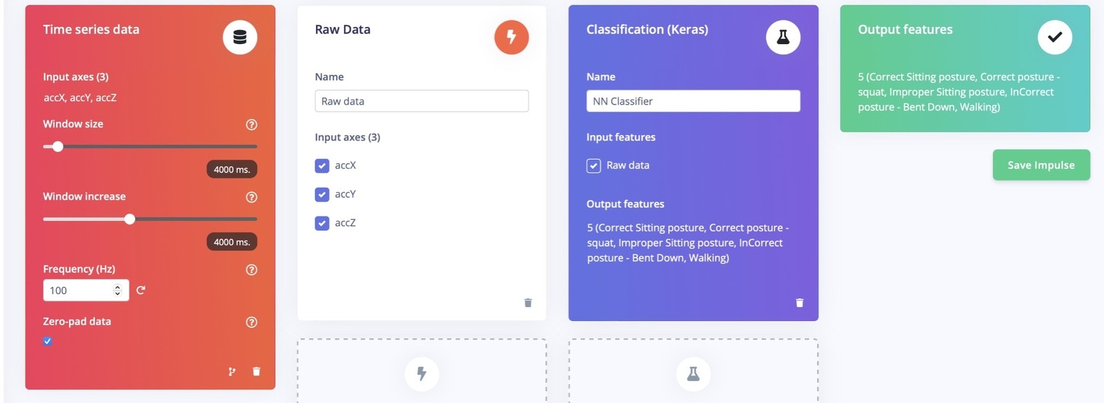 In Edge Impulse, on the Create Impulse section, set the “window sampling size” to 4000ms and the “window increase size” is also set as 4000 ms. The preprocessing is selected as “raw” data.