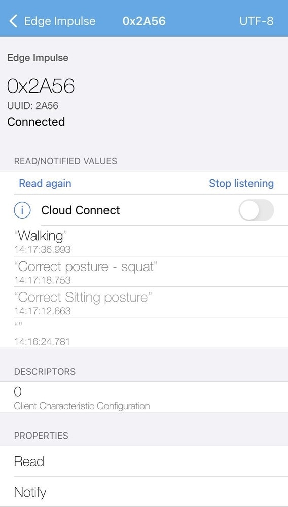 To test it in a real scenario, download the LightBlue application from the Apple App Store or Google Play Store. This application will be used to communicate to the Thunderboard Sense 2 over Bluetooth. Open the App and connect to the Edge Impulse service (Make sure board is powered up). Some settings in the App might need to be changed to the following values:- Subscribe to the