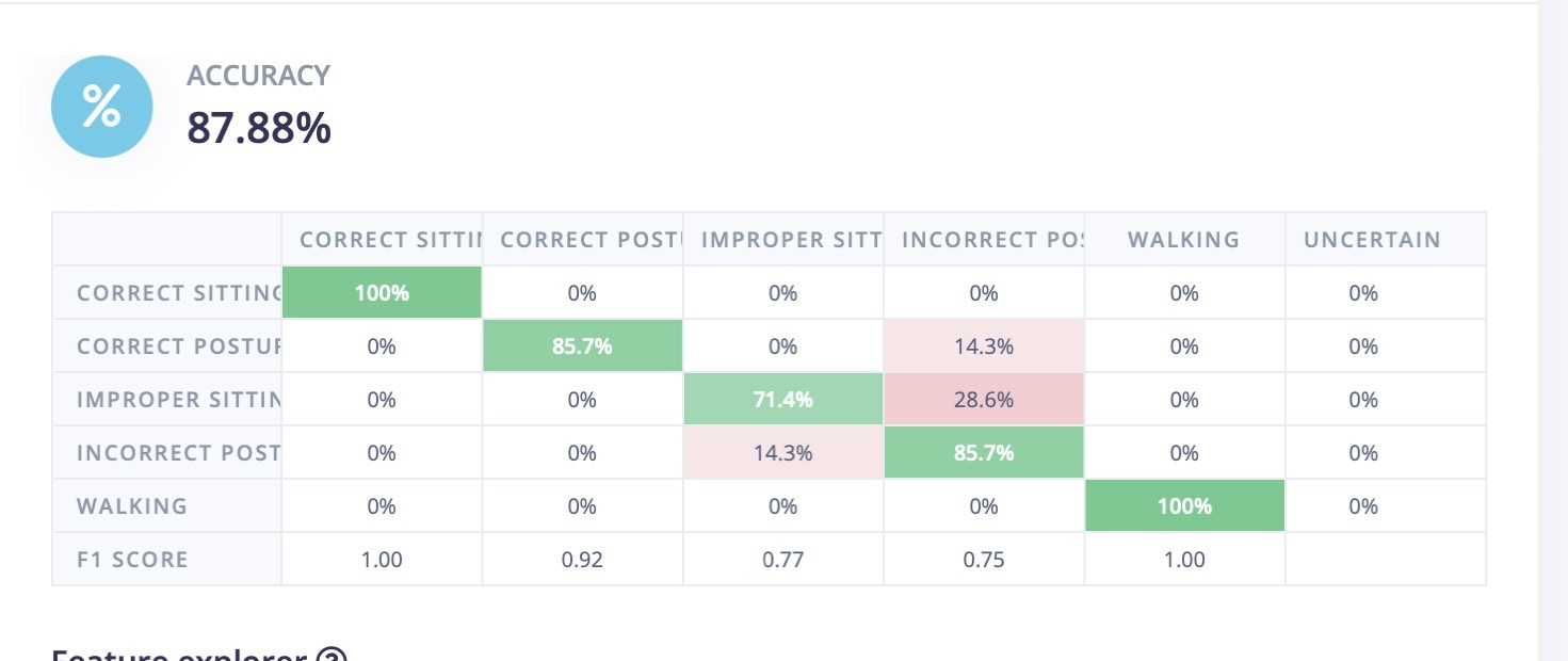 In model testing, I have used the data that we collected and set aside earlier to test the model. Here, the model achieved 87% accuracy. This data is completely new and was not used in training sessions, so it is unseen up to now. The decrease in model accuracy does sometimes occur, it looks like the improper sitting position is being incorrectly classified as “squat” data.