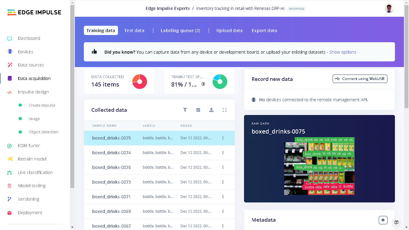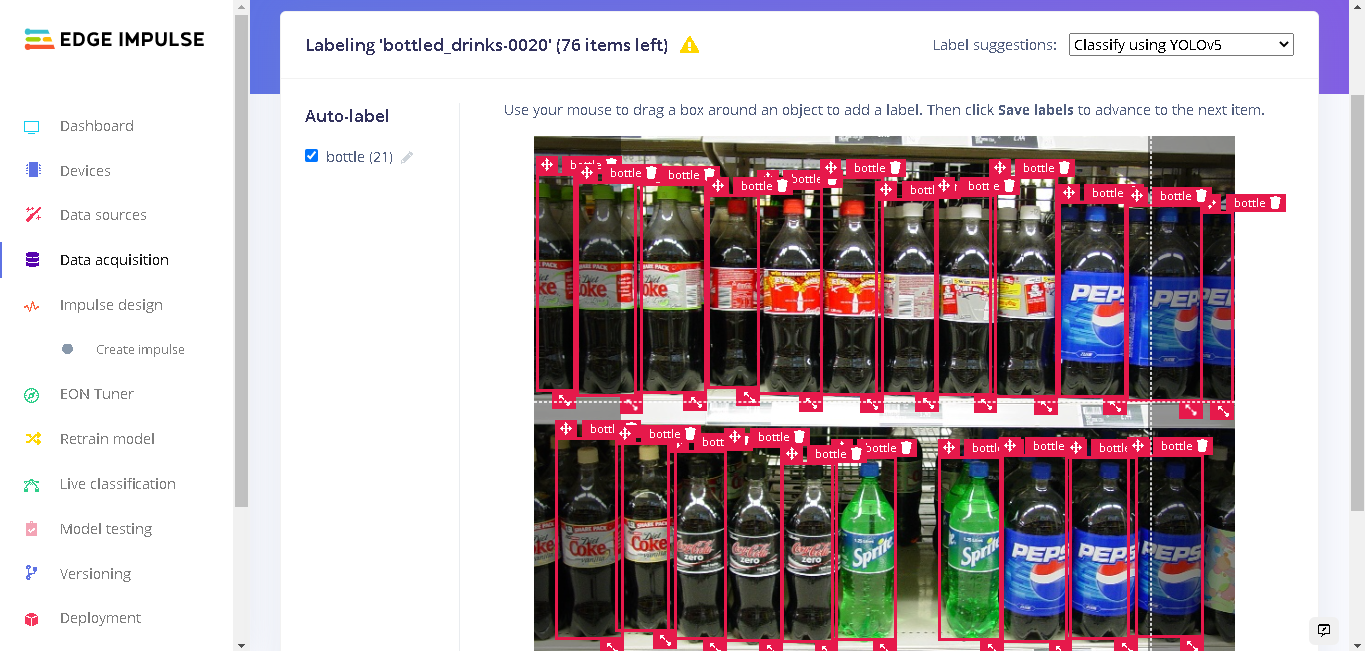 The primary method of inventory management in retail, warehouse, manufacturing, and logistics is simply counting parts or stock. This procedure ensures that the inventory on the sales floor, or in the warehouse meets requirements for production, sale, or spare capacity. In retail, this is done to ensure there are enough goods available for sale to consumers. Even with many technology advancements and improved production and capacity planning, physical inventory counting is still required in the modern world. This is a time consuming and tedious process, but machine learning and computer vision can help decrease the burden of physical inventory counting. To demonstrate the process of inventory counting, I trained a machine learning model that can identify a bottle and a box/carton drink on store shelves, and their counts are displayed in a Web application. For the object detection component, I used Edge Impulse to label my dataset, train a YOLOv5 model, and deploy it to the Renesas RZ/V2L Evaluation Board Kit. You can find the public Edge Impulse project here: Inventory Tracking in Retail with Renesas DRP-AI.Dataset Preparation