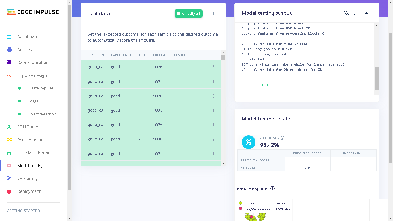 After training a model, we need to do a test with the unseen (Test) data. In my case, the model had an accuracy of 91%. This accuracy is a percent of all samples with a precision score above 98%.