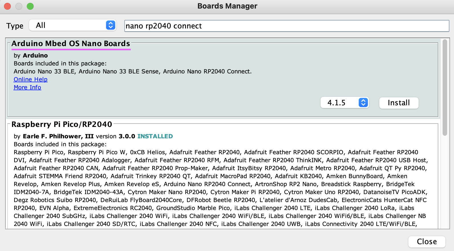 Please follow the instructions here to download and install the Arduino IDE. After installation, open the Arduino IDE and install the board package for the Arduino Mbed OS Nano Boards by going to Tools > Board > Boards Manager. Search the board package as shown below and install it.