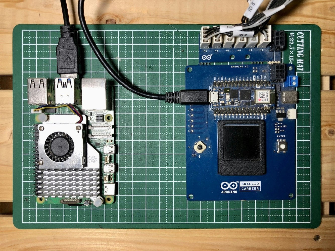 The micro-ROS stack integrates microcontrollers seamlessly with standard ROS 2 and brings all major ROS concepts such as nodes, publishers, subscriptions, parameters, and lifecycle onto embedded systems. We will use micro-ROS on the Arduino Nano RP2040 Connect mounted on the Braccio Carrier board. The Arduino Nano RP2040 will publish the joint states and subscribe to the arm manipulation commands. It will communicate to ROS 2 on the Raspberry Pi 5 over serial port transports.