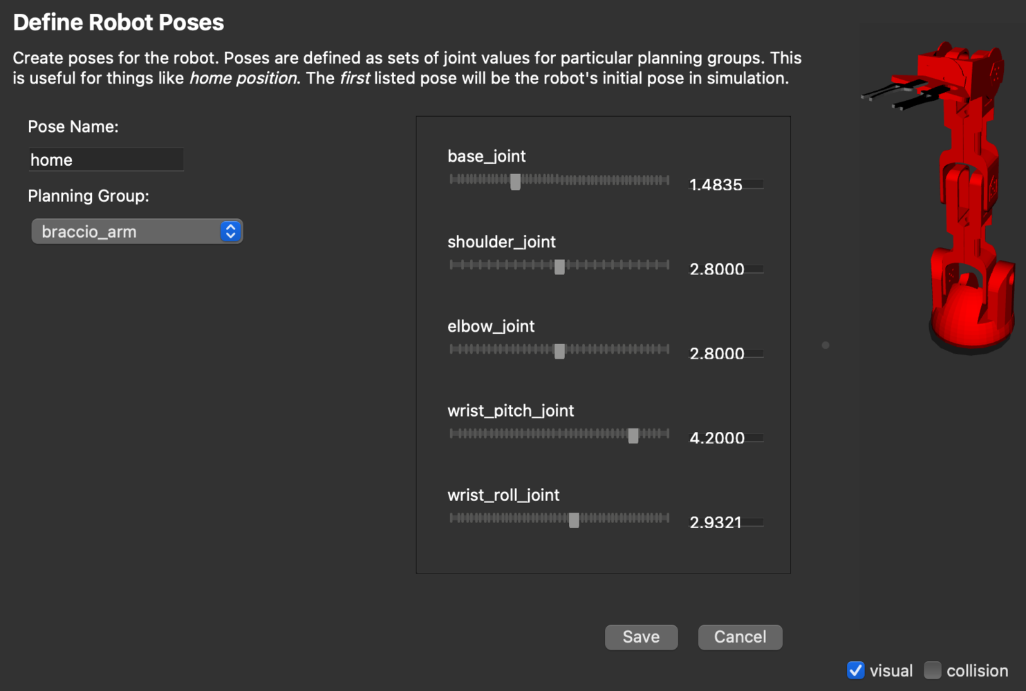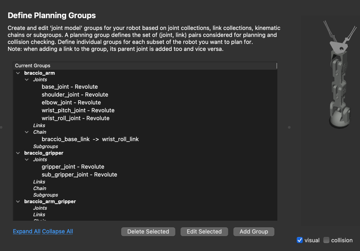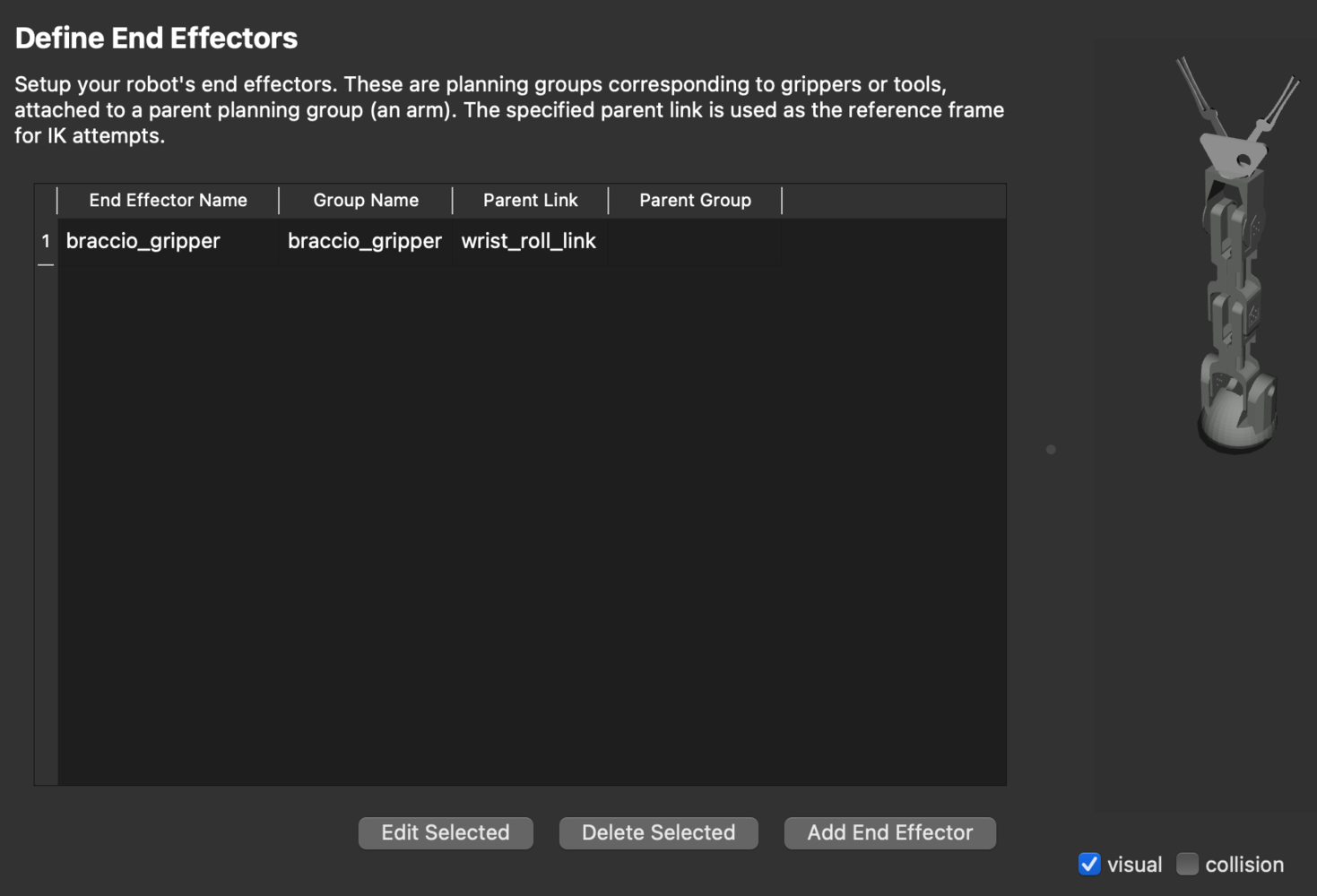 braccio_gripper group as an end effector. The end effectors can be used for attaching objects to the arm while carrying out pick-and-place tasks.