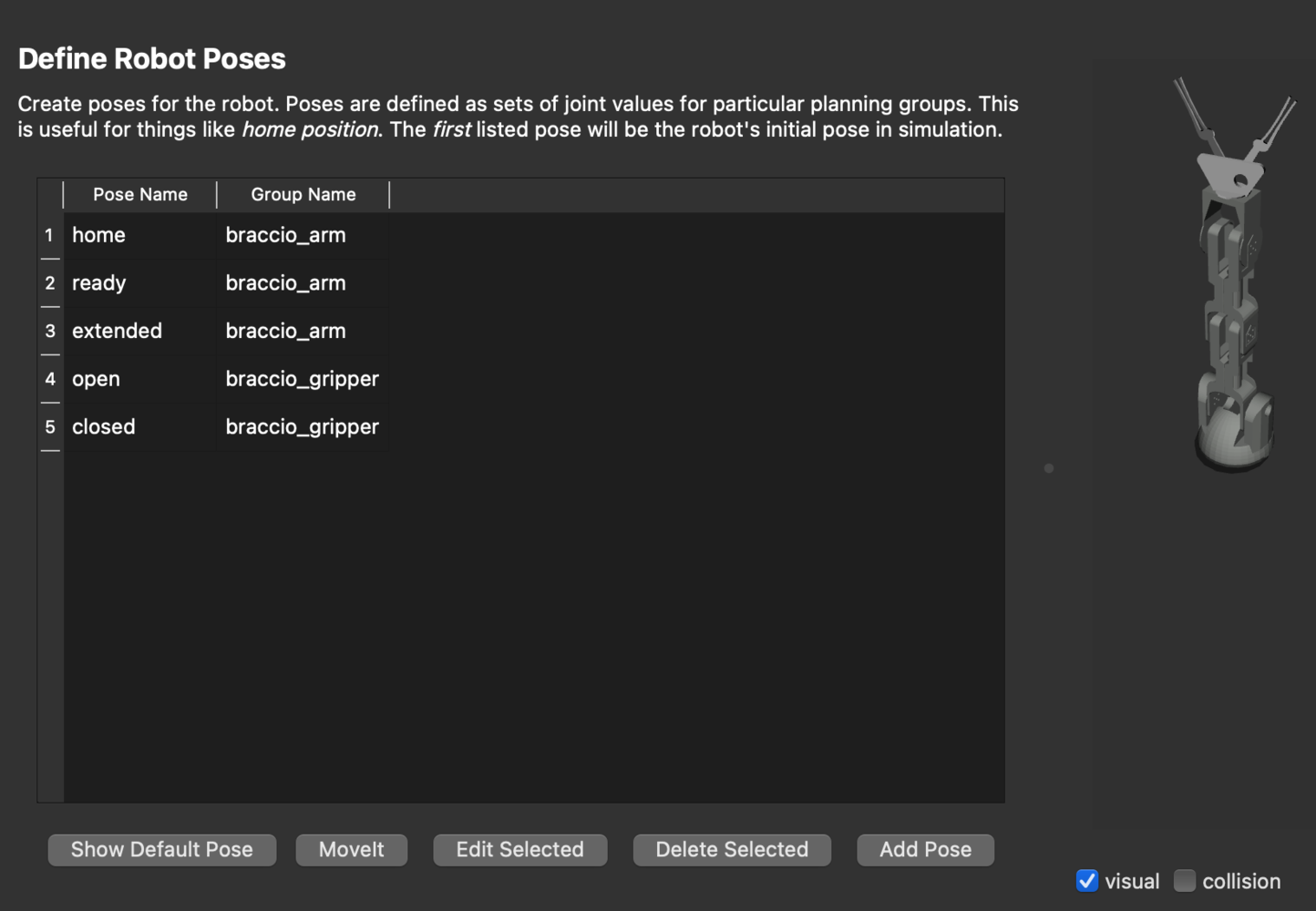 The MoveIt Setup Assistant 2.0 is a GUI for configuring the manipulator for use with MoveIt 2. Its primary function is generating a Semantic Robot Description Format (SRDF) file for the manipulator, which specifies additional information required by MoveIt 2 such as planning groups, end effectors, and various kinematic parameters. Additionally, it generates other necessary configuration files for use with the MoveIt 2 pipeline. To start the MoveIt Setup Assistant 2.0, execute the commands below.braccio.urdf file from the moveit_resources_braccio_description package.