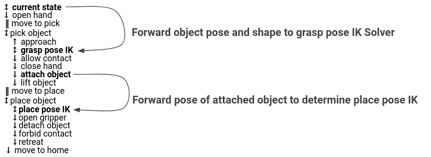 pick_n_placenode plans a pick and place operation using MoveIt Task Constructor. MoveIt Task Constructor provides a way to plan for tasks that consist of multiple different subtasks (known as stages as shown in the image below).