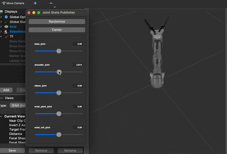 We can verify if the URDF is functioning as expected by publishing simulated joint states and observing the changes in the robot model using the RViz 2 graphical interface. Execute the following commands to install theurdf_launch and joint_state_publisher packages and launch the visualization.