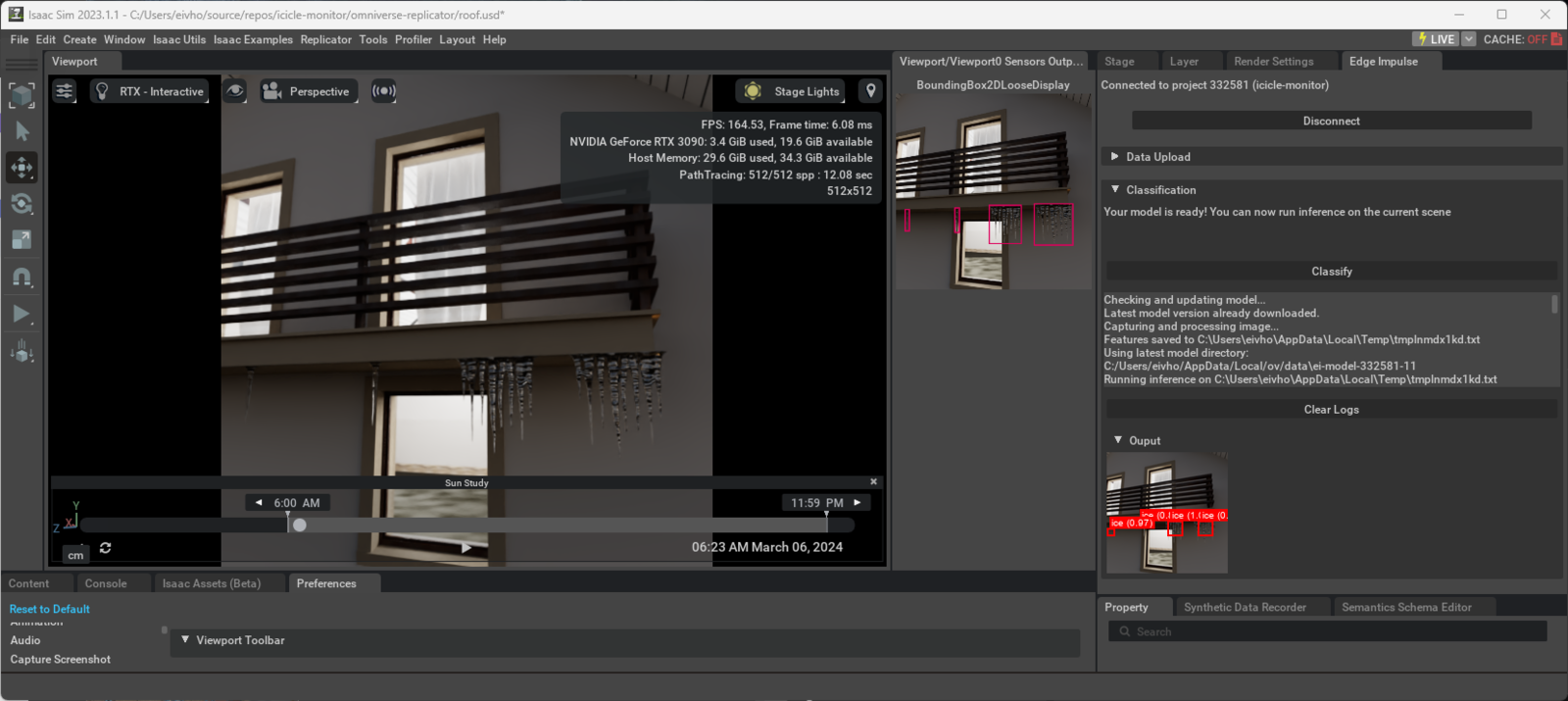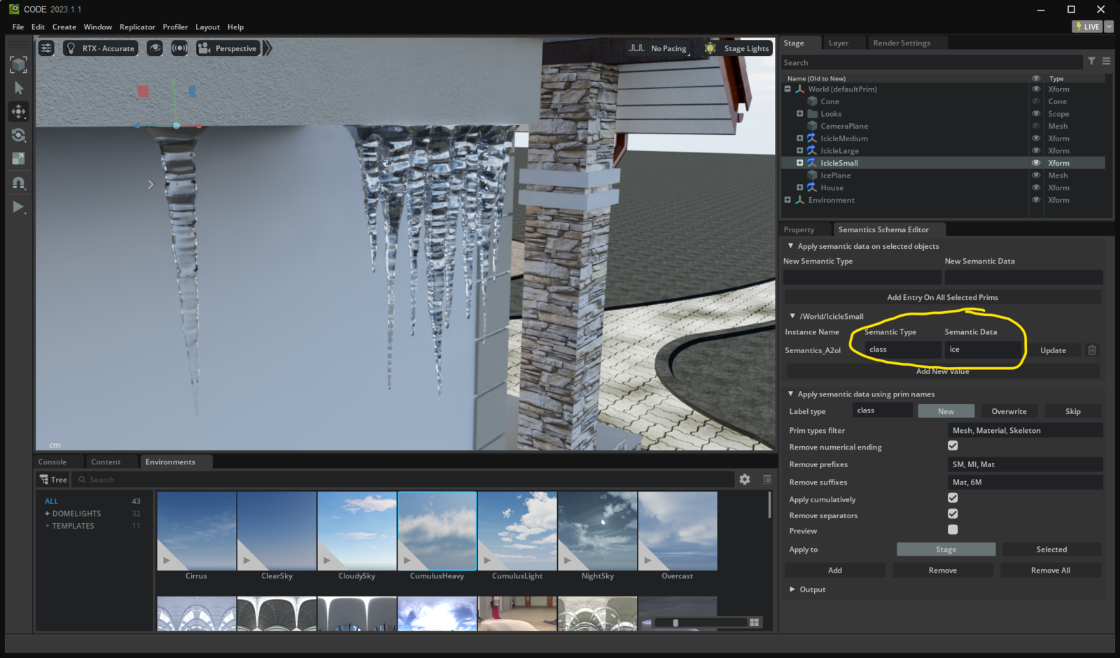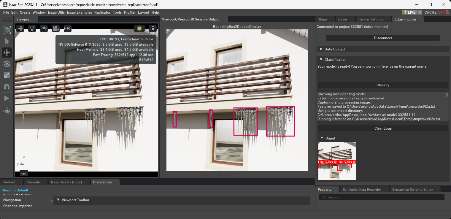 .png files. Note that labels are created setting bounding_box_2d_loose. This is used in this case instead of bounding_box_2d_tight as the latter in some cases would not include the tip of the icicles in the resulting bounding box. It also creates labels from the previously defined semantics. The code ends with running a single iteration of the process in Omniverse Code, so we can preview the results.