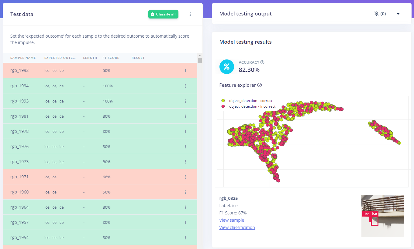 Since our synthetic training images are based on both individual and two different sized clusters of icicles, we canβt trust the model performance numbers too much. Greater F1 scores are better, but we will never achieve 100%. Still, we can upload increasing numbers of labeled images and observe how performance numbers increase. 2,000 images: