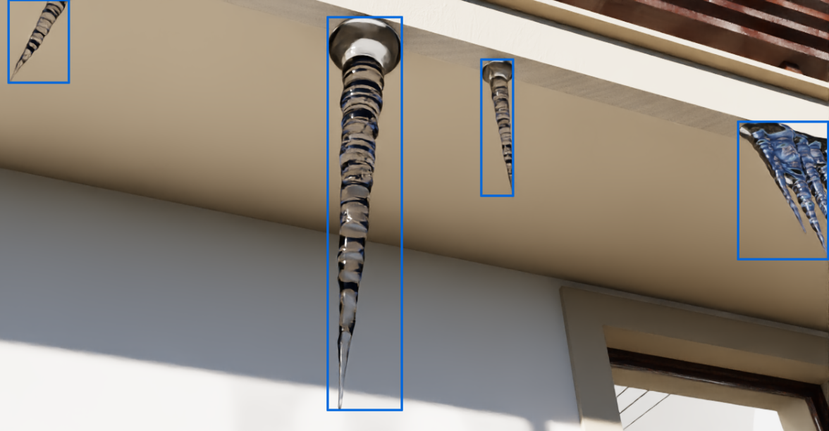 Icicle formation is detected using a neural network (NN) designed to identify objects in images from the onboard camera. The NN is trained and tested exclusively on synthesized images. The images are generated with realistic simulated lighting conditions. A small amount of real images are used to later verify the model.Challenges
