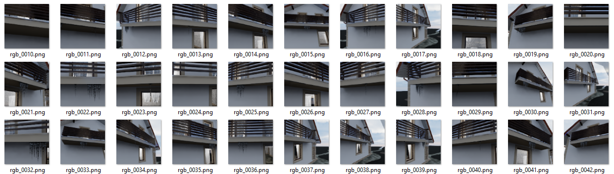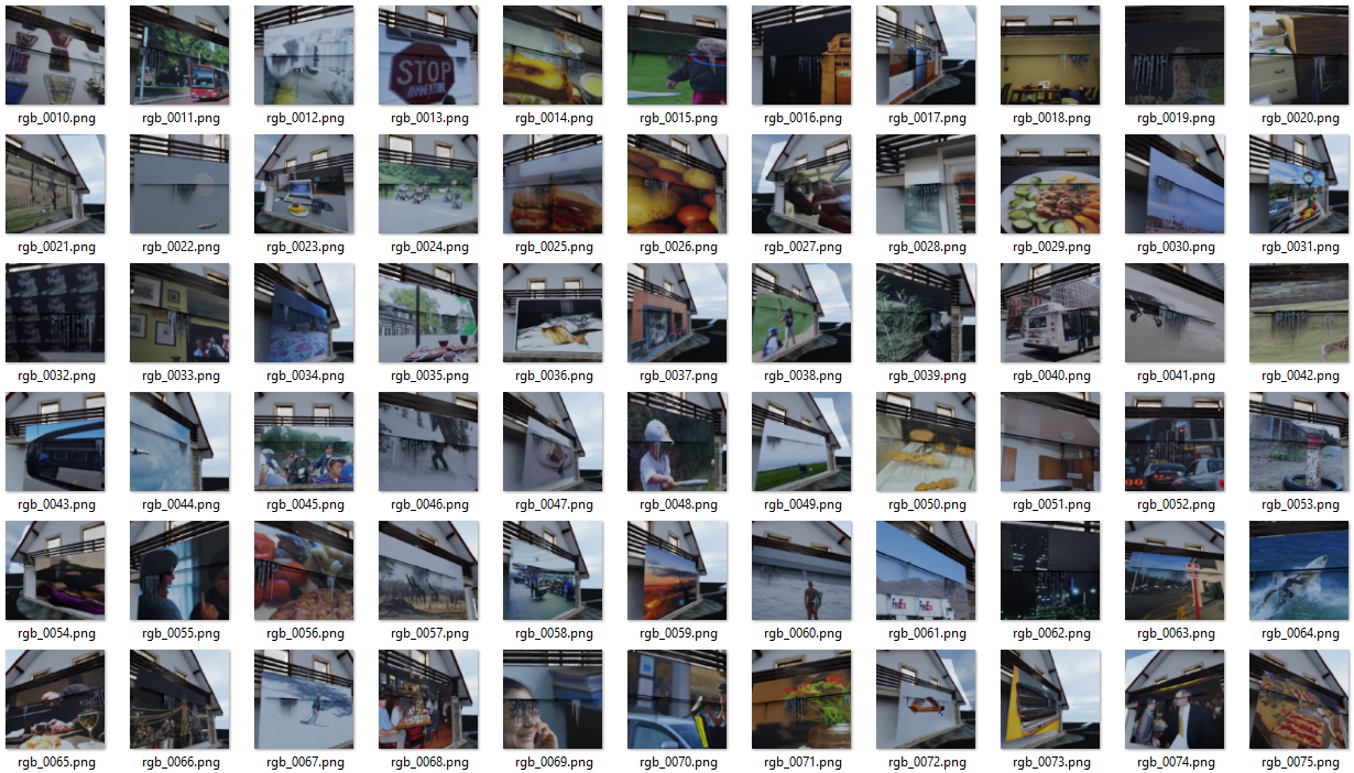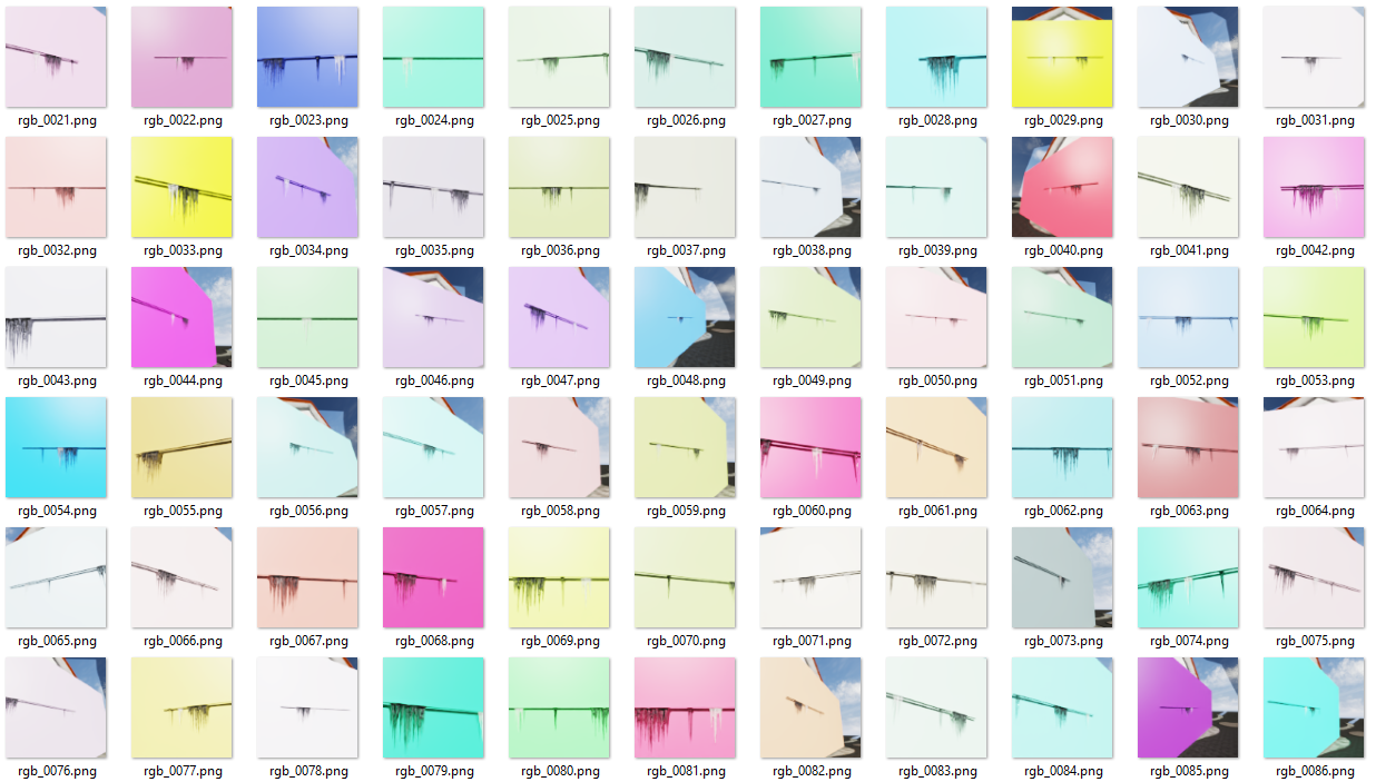 To further steer training of the object detection model in capturing features of the desired class, the icicles, and not features that appear due to short comings in the domain randomization, we can create images with the icicles in front of a large variety of background images. A simple way of achieving this is to use a large dataset of random images and randomly assigning one of them to a background plane for each image generated.