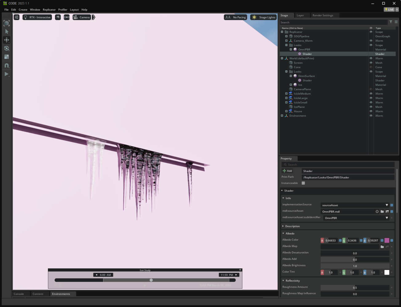 The surface behind the icicles may vary greatly, both in color and texture. Using Replicator randomizing the color of an objectβs material is easy. In the scene in Omniverse, either manually create a plane behind the icicles, or create one programmatically. In Code, define a function that takes in a reference to the plane we want to randomize, the color of the distribution functions with min and max value span: