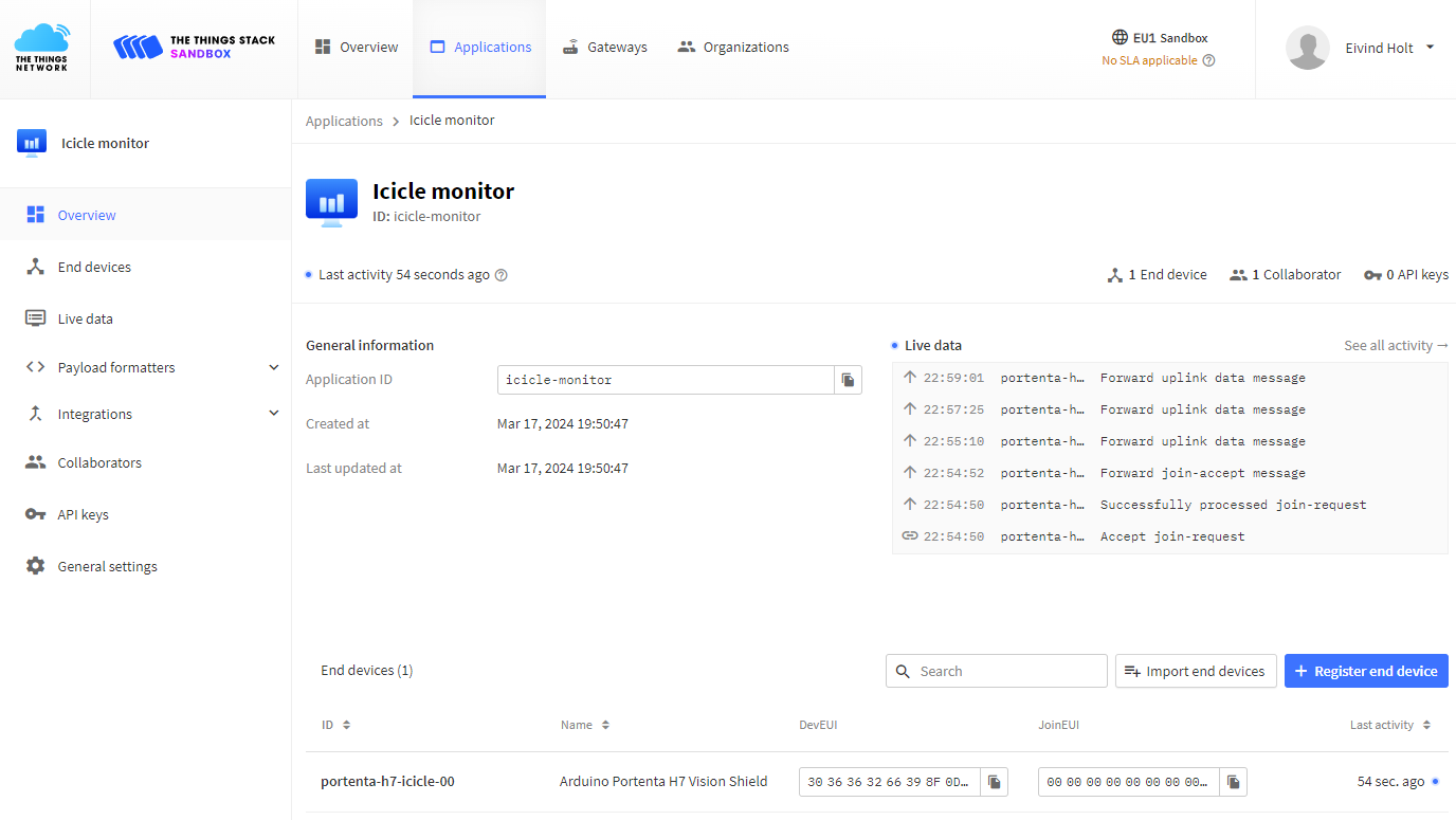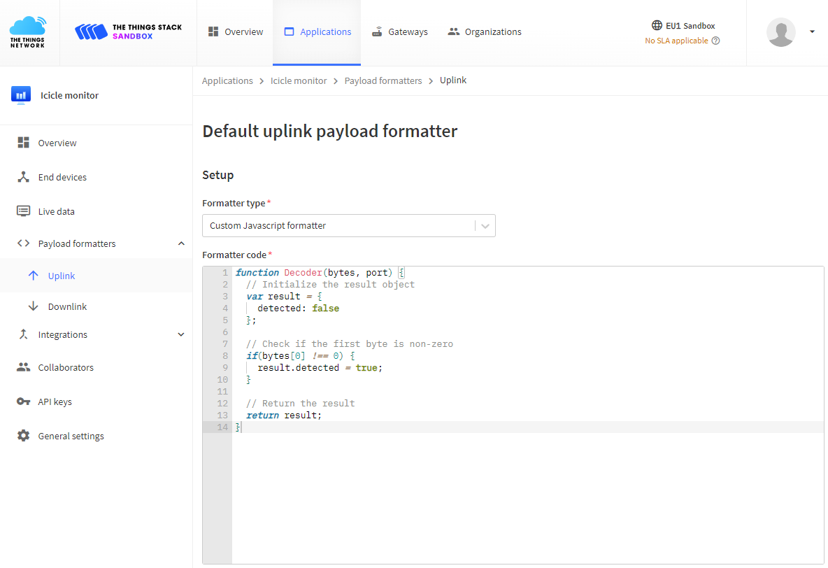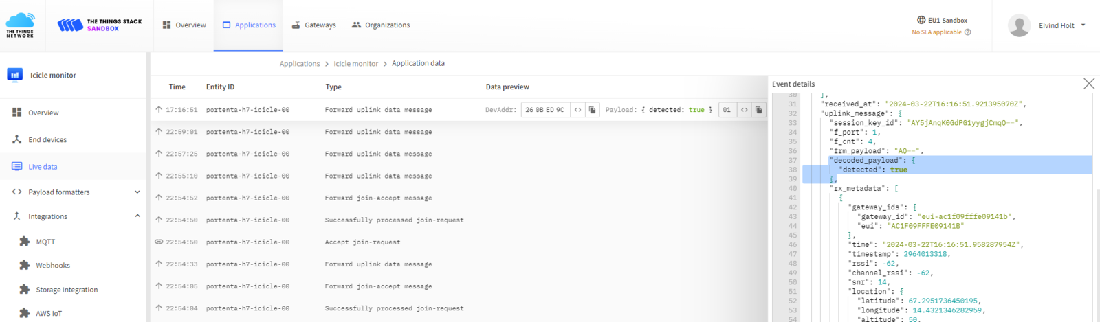 1 to the The Things Stack application. It is probably obvious that the binary payload is redundant, the presence of a message is enough, but this could be extended to transmit other data, for example the prediction confidence, number of clusters, battery level, temperature or light level.