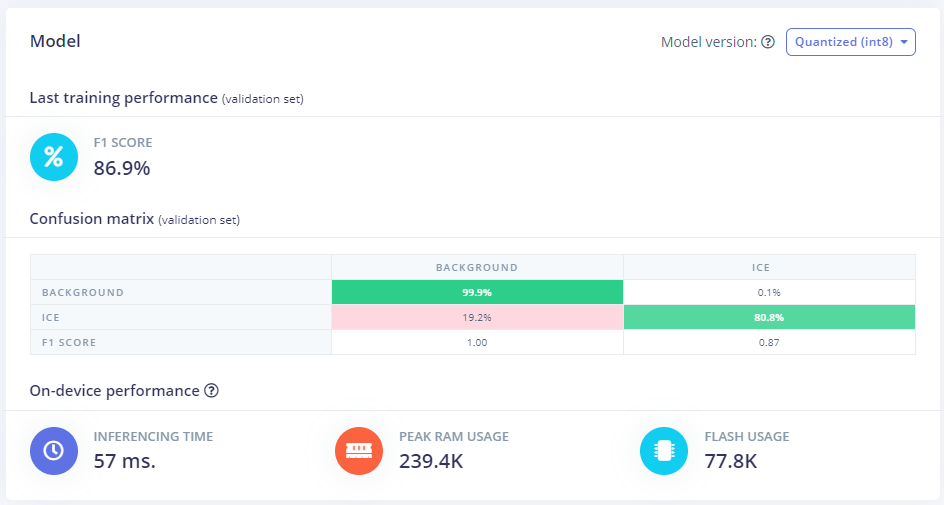 A powerful platform combined with a high resolution camera with fish-eye lens would increase the ability to detect icicles. However, by deploying the object detection model to a small, power-efficient, but highly constrained device, options for device installation increase. Properly protected against moisture this device can be mounted outdoors on walls or poles facing the roofs in question. LoRaWAN communication enables low battery consumption and long transmission range.