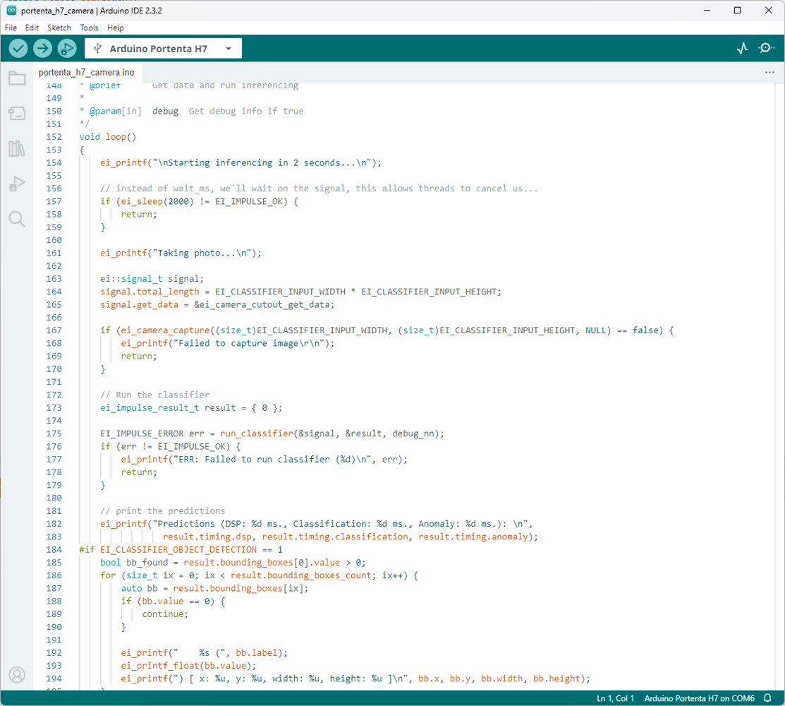ei_object_detection.py code. Remember to change: sensor.set_pixformat(sensor.GRAYSCALE). The file edge_impulse_firmware_arduino_portenta.bin is our firmware for the Arduino Portenta H7 with Vision shield.