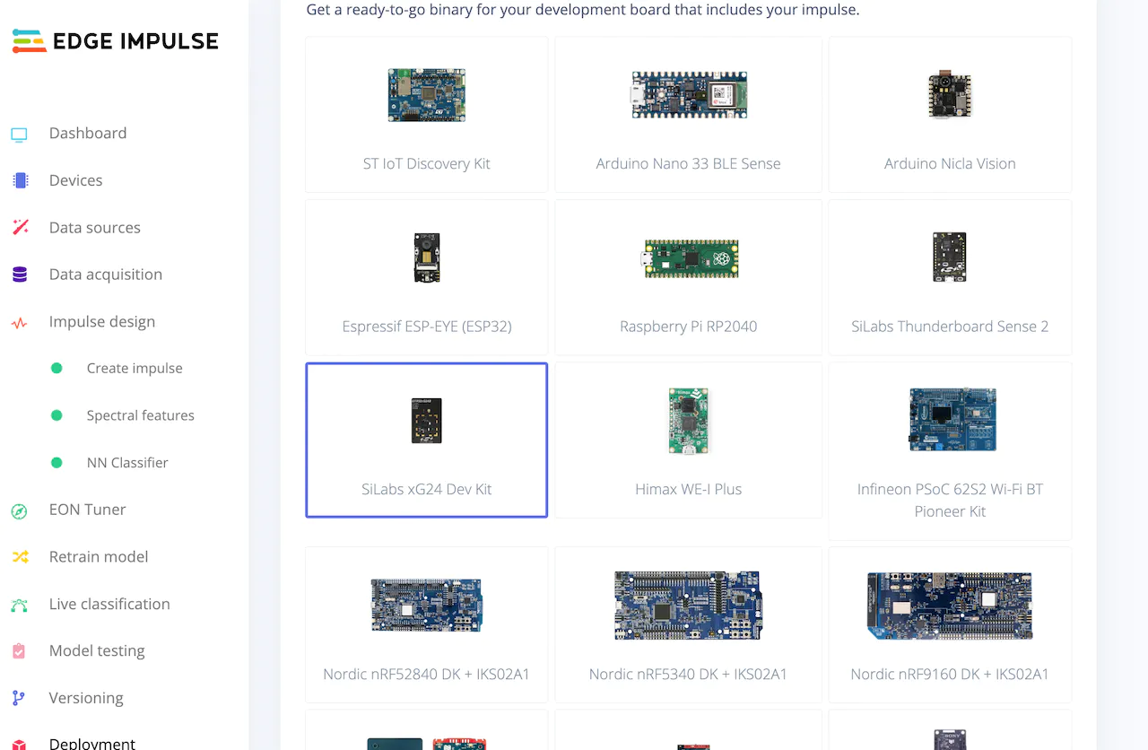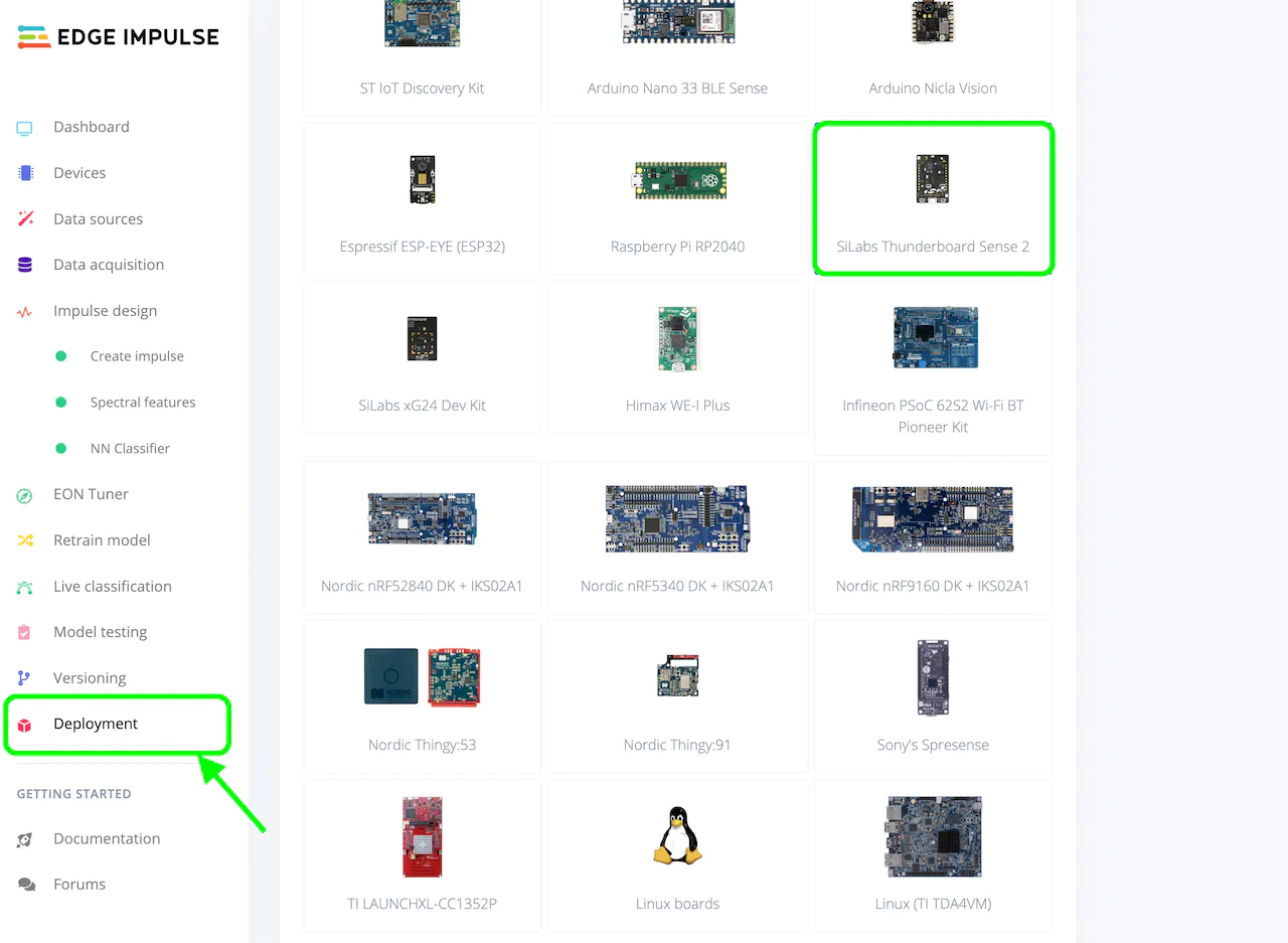 When you are done retraining, navigate to the “Deployment” page from the left menu, select “SiLabs Thunderboard Sense 2” under “Build firmware”, then click on the “Build” button, which will build your model and download a.bin file used to flash to the board.