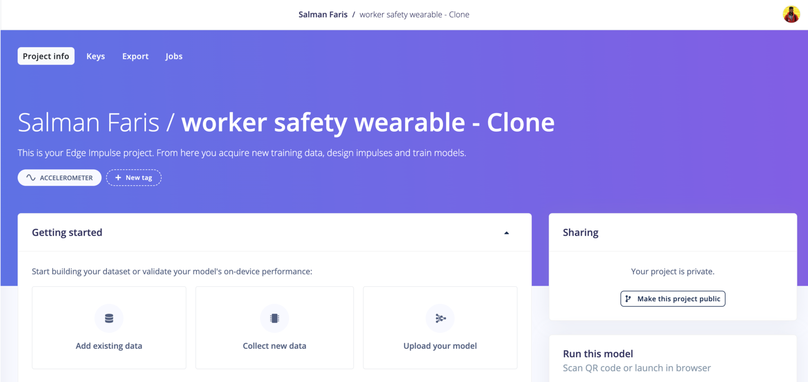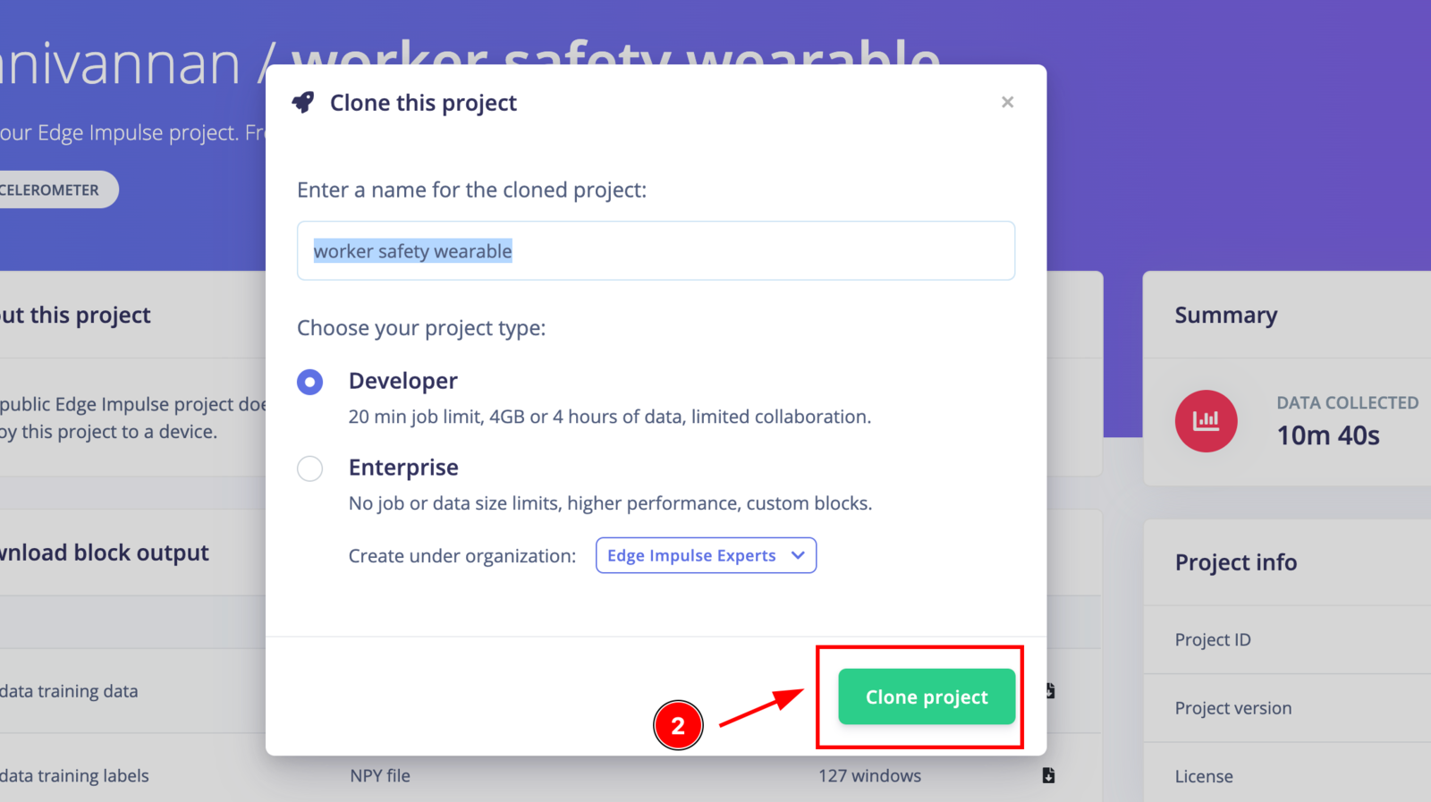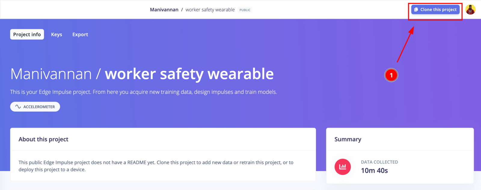Go to the Edge Impulse project page using the link here, and clone it. Click Clone on the right corner button to create a copy of the project.