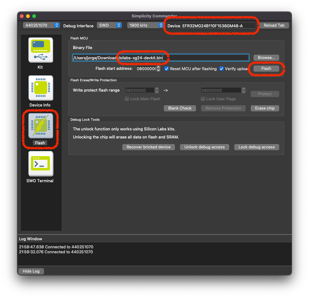 firmware-xg24.hex). You can now press the Flash button to load the base firmware image onto the xG24 Dev Kit.