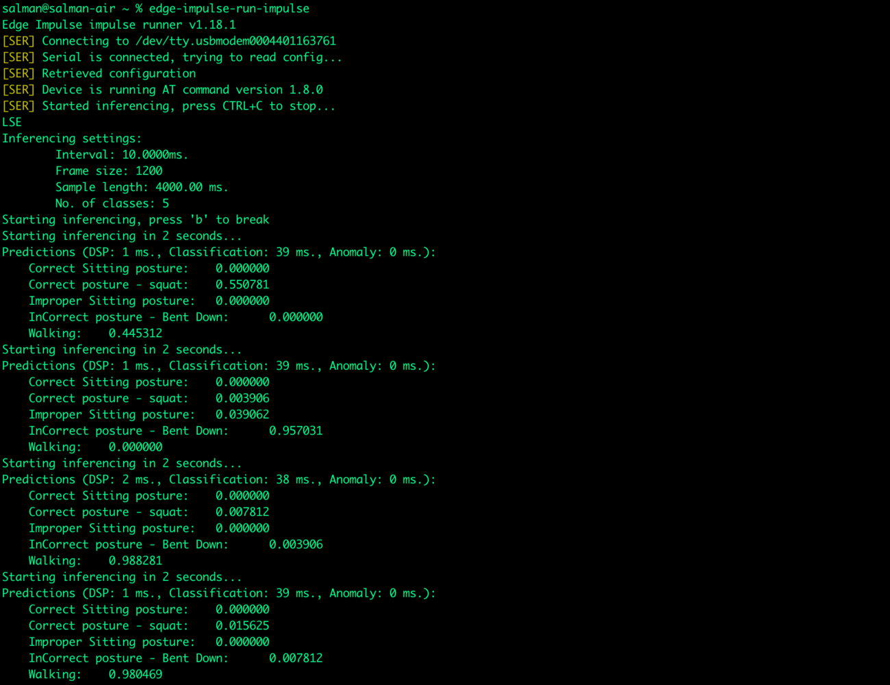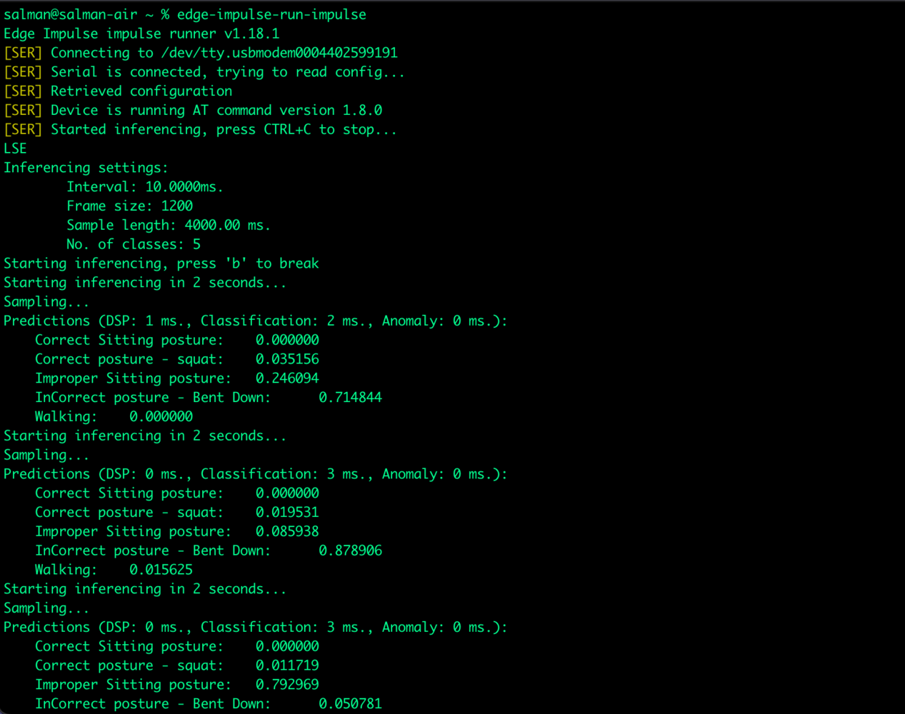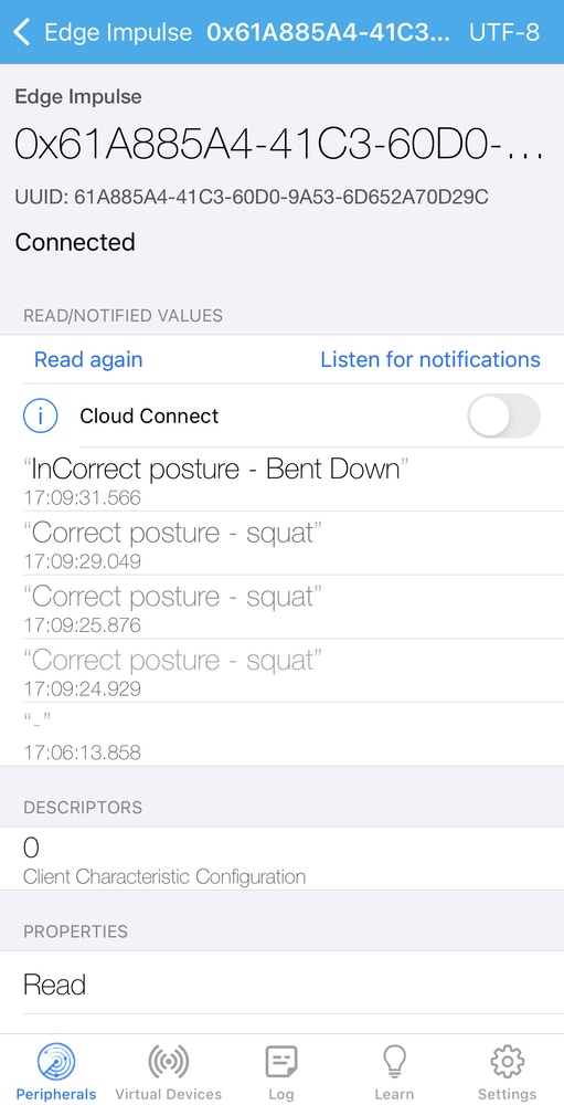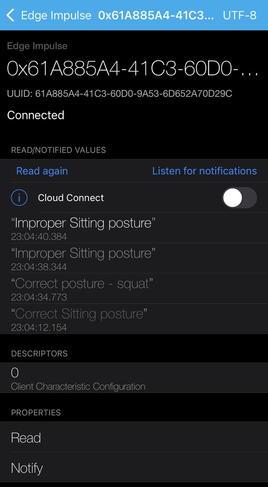You can find more about the project here in the original project documentation, Worker Safety Posture Detection. The project is intended to help workers in manufacturing. They work in conditions that can put a lot of stress on their bodies. Depending on the worker’s role in the production process, they might experience issues related to cramped working conditions, heavy lifting, or repetitive stress. Poor posture can cause problems for the health of those who work in manufacturing. Along with that, research suggests that making efforts to improve posture among manufacturing employees can lead to significant increases in production. Workers can improve their posture by physical therapy, or simply by being more mindful during their work day. Manivnnan Sivan has created a wearable device using a SiLabs Thunderboard Sense 2 which can be fitted to a worker’s waist. The worker can do their normal activities, and the TinyML model running on the hardware will predict the posture and communicate to the worker through BLE communication. The worker can get notified in the Light Blue App on their phone or smartwatch.Running the Project on Thunderboard Sense 2