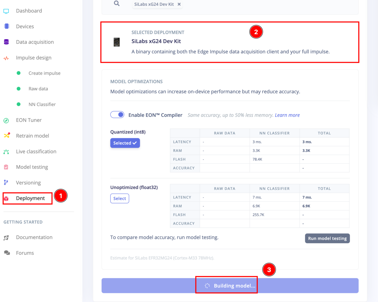 Choose “Deployment” from the left toolbar and then choose the target device as “SiLabs Thunderboard Sense 2”, and click “Build” to start the process.