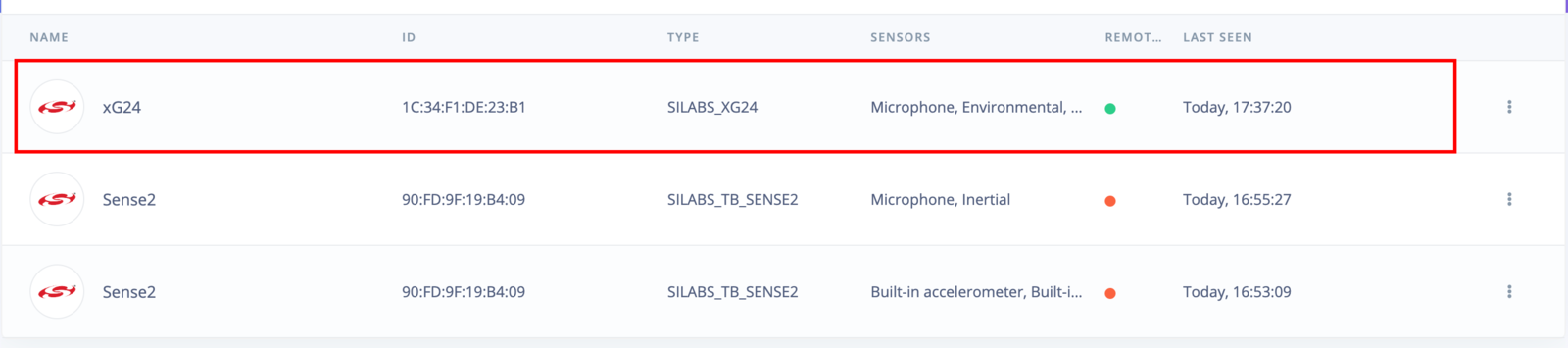 - Load the base firmware image with Simplicity Commander - You can use Simplicity Commander to flash your xG24 Dev Kit with the Edge Impulse base firmware image. To do this, first select your board from the dropdown list on the top left corner: