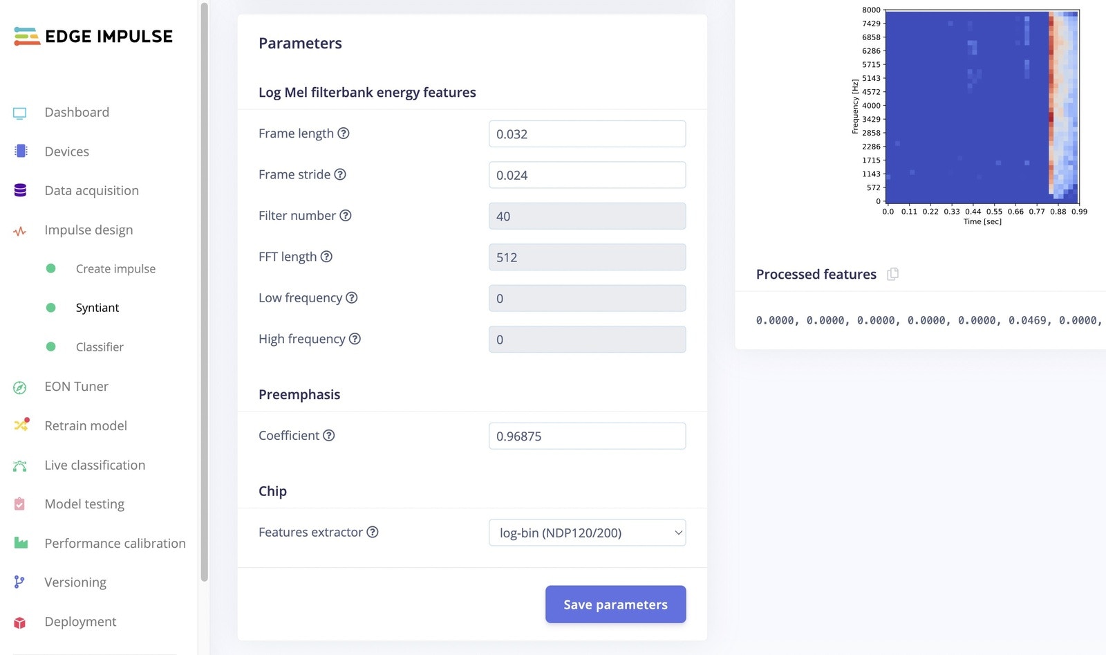 Choose Create Impulse, set Window size to around 1 sec, then add an Audio (Syntiant) Processing block, and choose Classifier for the Learning block, then Save Impulse. In the Syntiant parameters, choose log-bin (NDP120/200) then click Save. Set the training to around 30 cycles with 0.0005 Learning rate, then click Start training. It will take a short while, but you can see the progress of the training on the right. If the results show a figure of around 90% accuracy upon completion, then we can most likely proceed to the next stage. Now we can test the model in Live classification, or choose Model testing to test with the data that was set aside earlier (the 80/20 split), and click Classify all. If the result is greater than 80% accuracy, then we can move to the next step — Deployment.