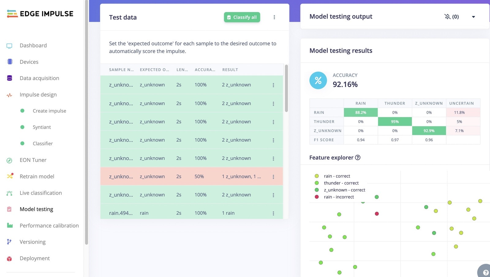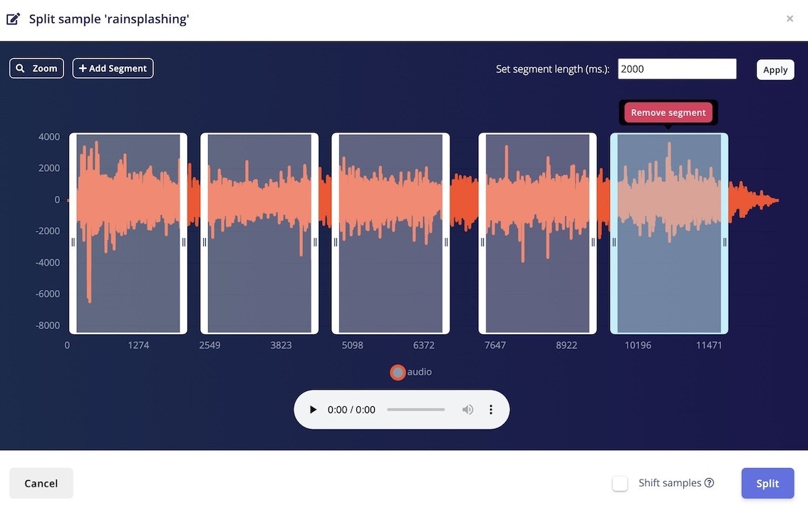 Click on a data sample that was collected, then click on the 3 dots to open the menu, and finally choose Split sample. Set the segment length to 2000 ms (2 seconds), or add segments manually, then click Split. Repeat this process until all samples are labelled in 2 second intervals. Make sure the comparison between rain, thunder and unknown data is quite balanced, and the ratio between training and test data is around 80/20.