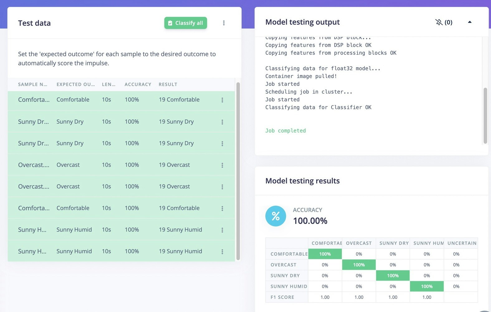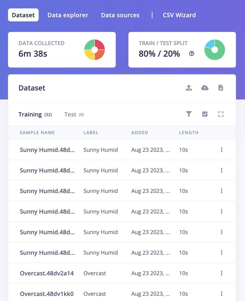 We need to prepare the Arduino Nano BLE Sense with the proper firmware to connect to the Edge Impulse Studio. Follow the instructions here to flash the firmware. We also need to build a set-up that can replicate conditions such as sunny dry, sunny humid, comfortable, and overcast. In this case we use an air-conditioned room, hot water, light, and an iron to create the necessary environments. Start with adding a new project in the Studio, and connect the Nano BLE Sense as described above. After the device is connected, in Data acquisition choose Environmental + Interactional in the sensor dropdown menu,1000ms for sample length, and label it appropriately. Start sampling. After all data are labelled and captured correctly (e.g. Overcast, Sunny Humid, Sunny Dry, Comfortable), make sure the ratio between Training and Test is ideally around 80/20.