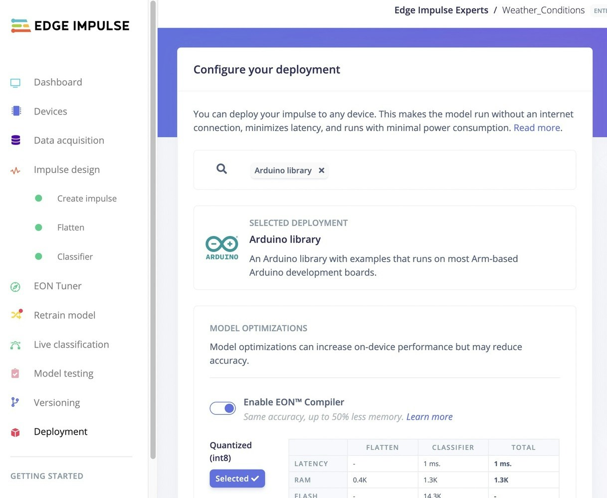 Select Arduino library in the Deployment tab. The library will build and it will automatically download an Arduino library.zip file. Place this zipped file into your Arduino Library folder.